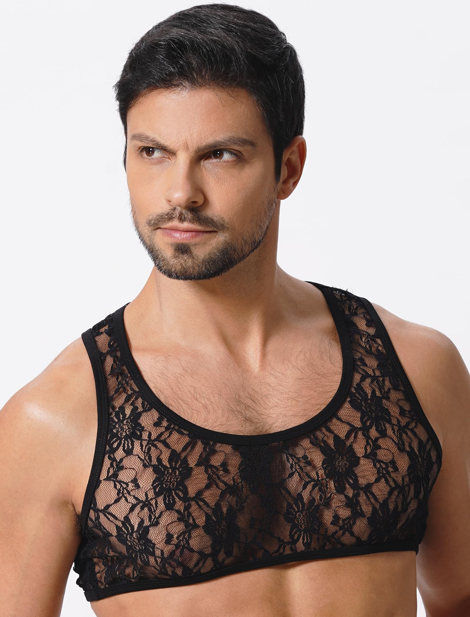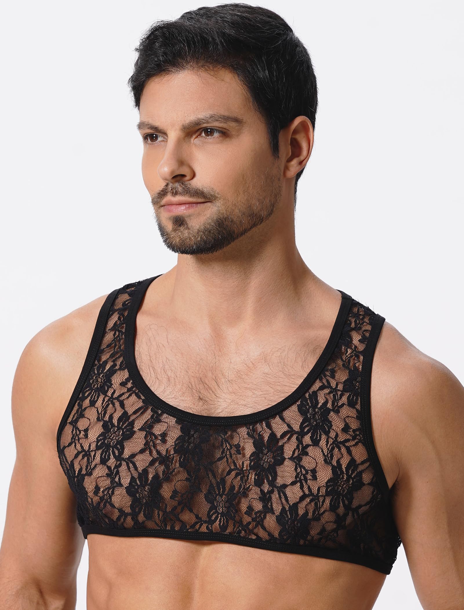 - Material: Nylon + Spandex. Men's lace undershirt crop tank top, made of soft lace material, breathable and stretchy , lightweight and breathable, sweat-absorbing. sheer see thru lace mesh crop top for men, for going out, rave party, festival.