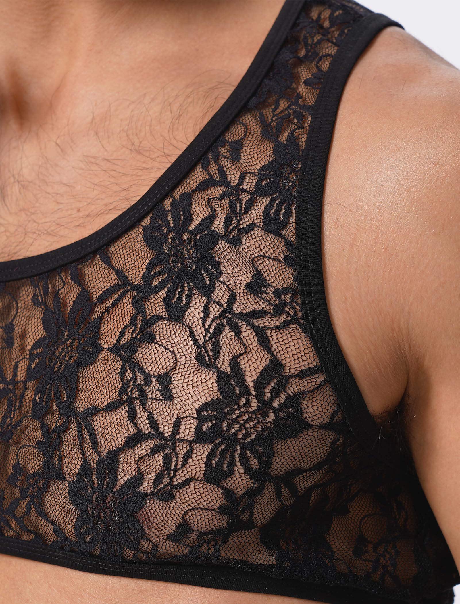 - Design: Sissy crop tops for men, cropped tank tops lace for men, lace crop top for men, cropped length, round neck sleeveless sheer tank top crop top for men, sheer see through muscle tank, with floral lace pattern, sexy muscle shirt for men.