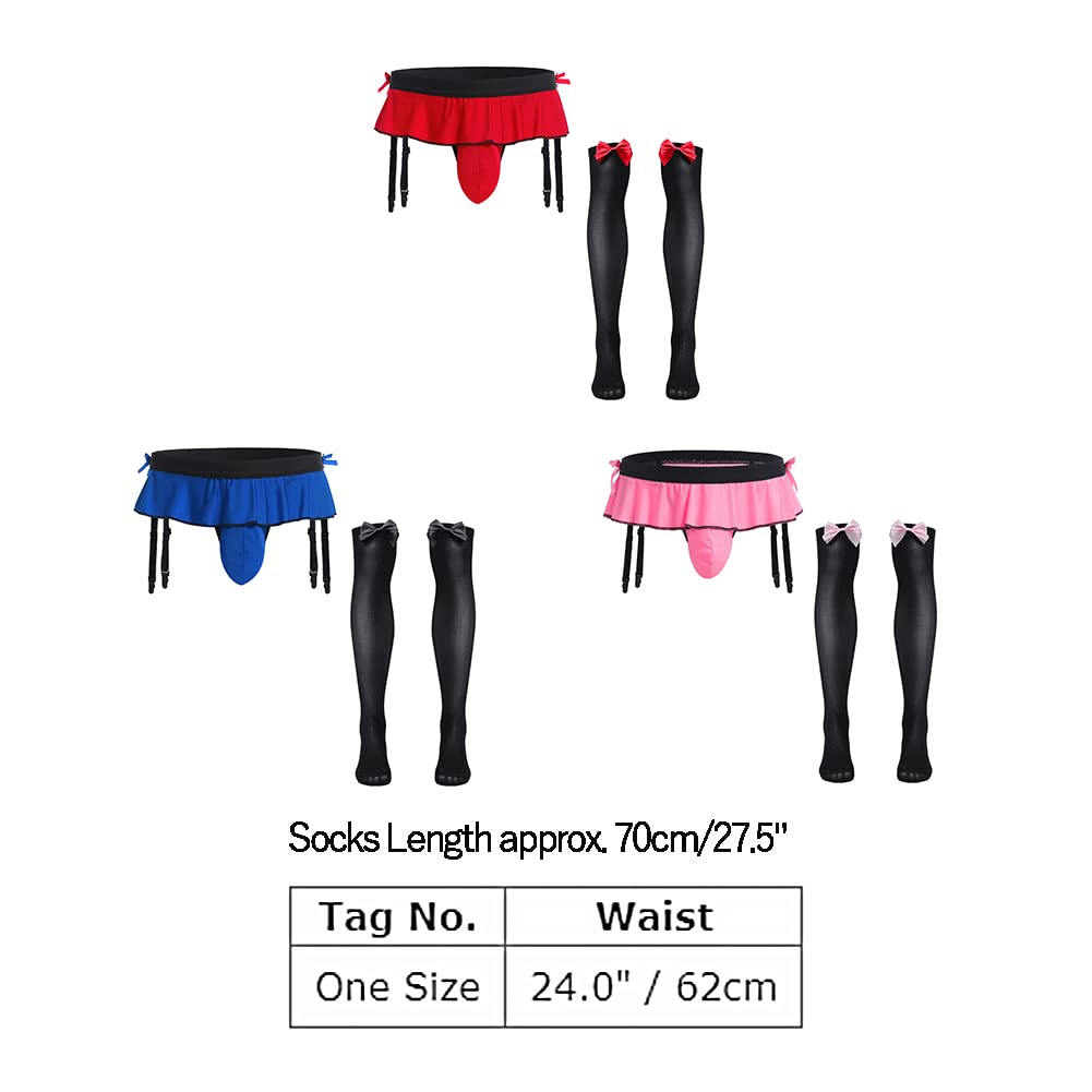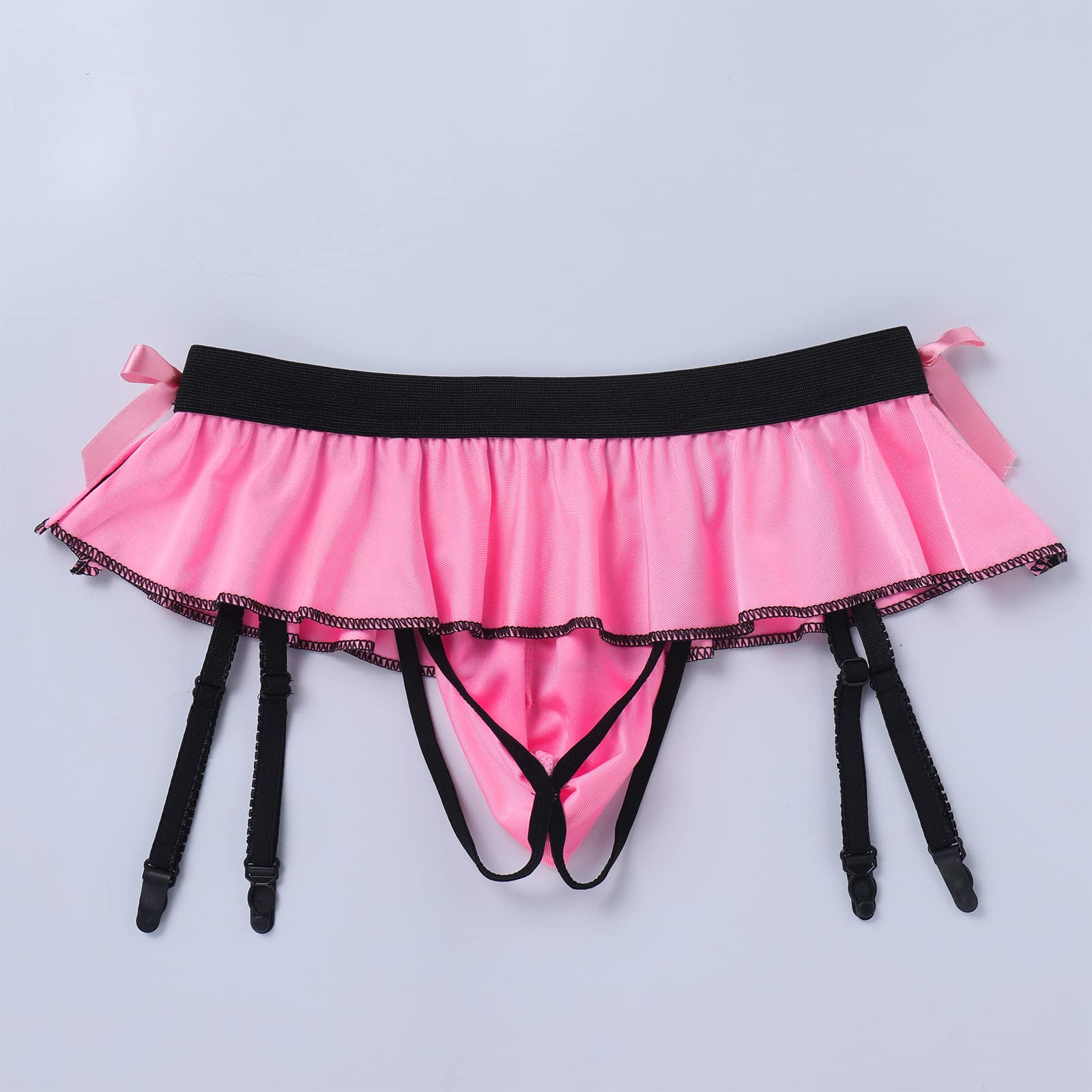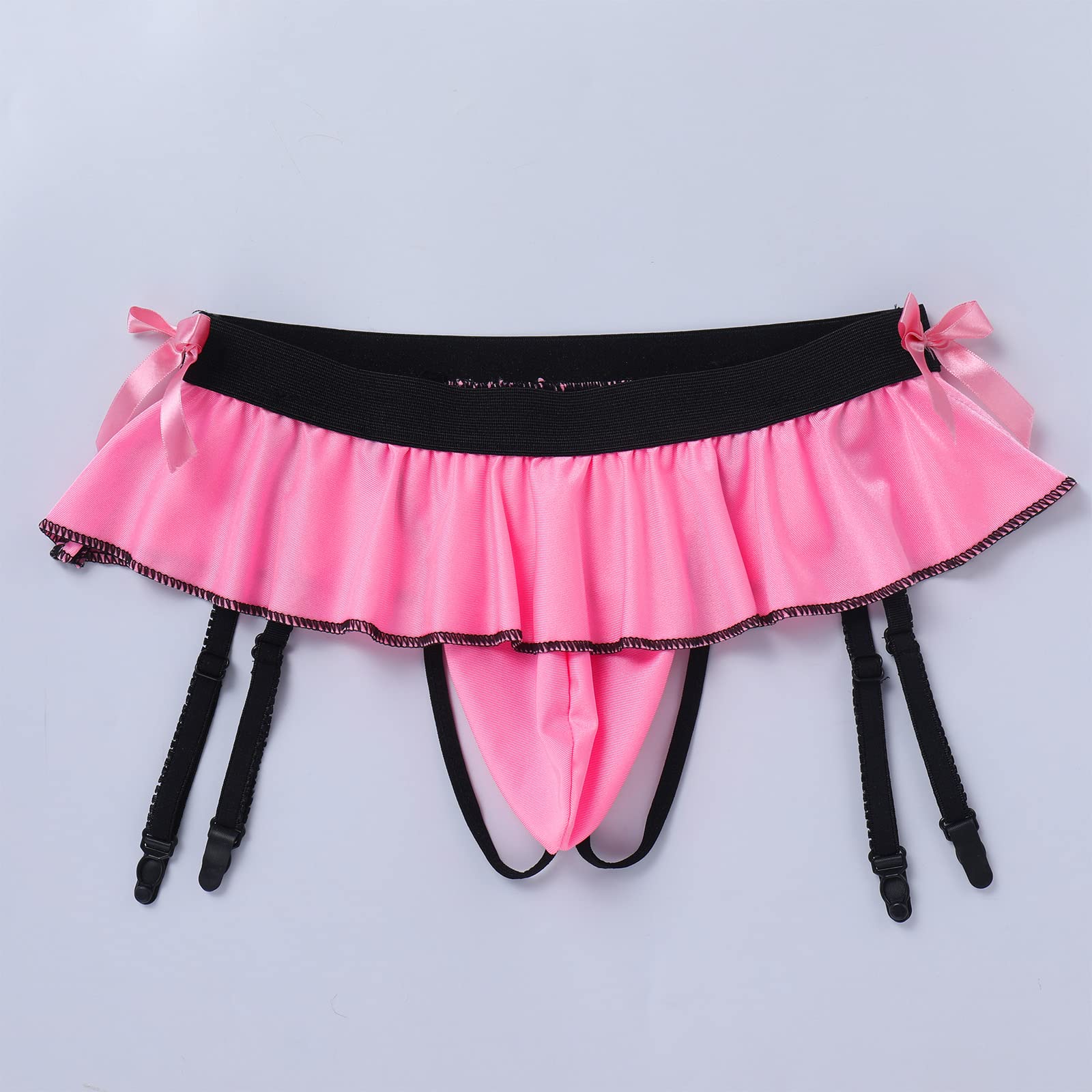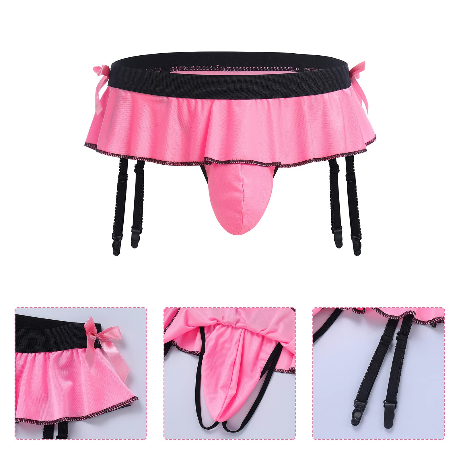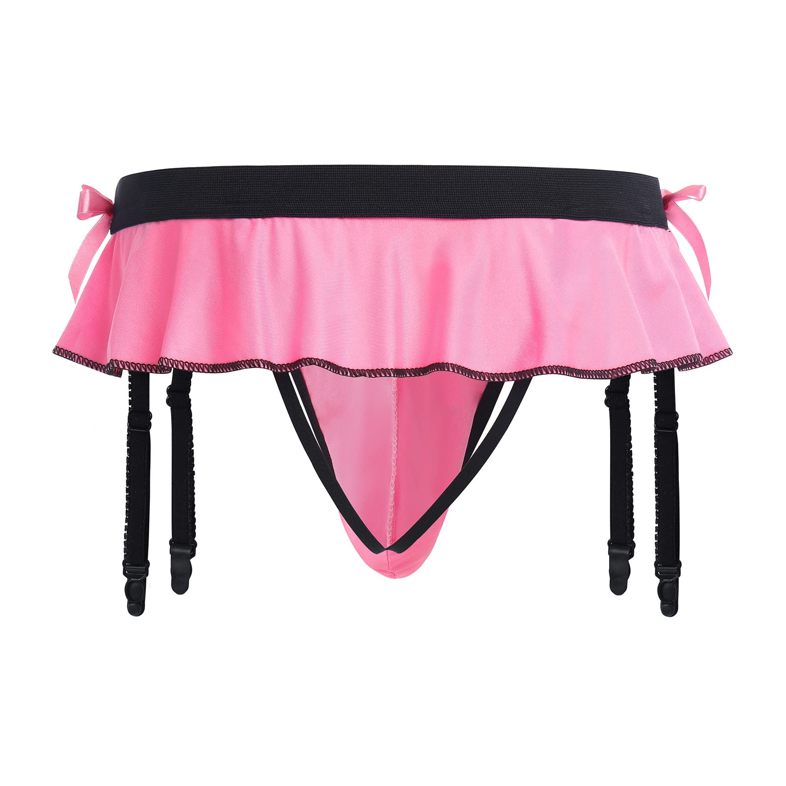 - DESIGN: Mens sissy panties with garters belt, low waisted design make you look more hot, decorated with cute mini bowknots at side waist, super sissy and girly. Frilly ruffle skirted panties for men, elastic waistband for better fit, elastic spandex straps offers you comfort wearing experience. Four adjustable garters can hold up the stocking to complete a more captivating look.
