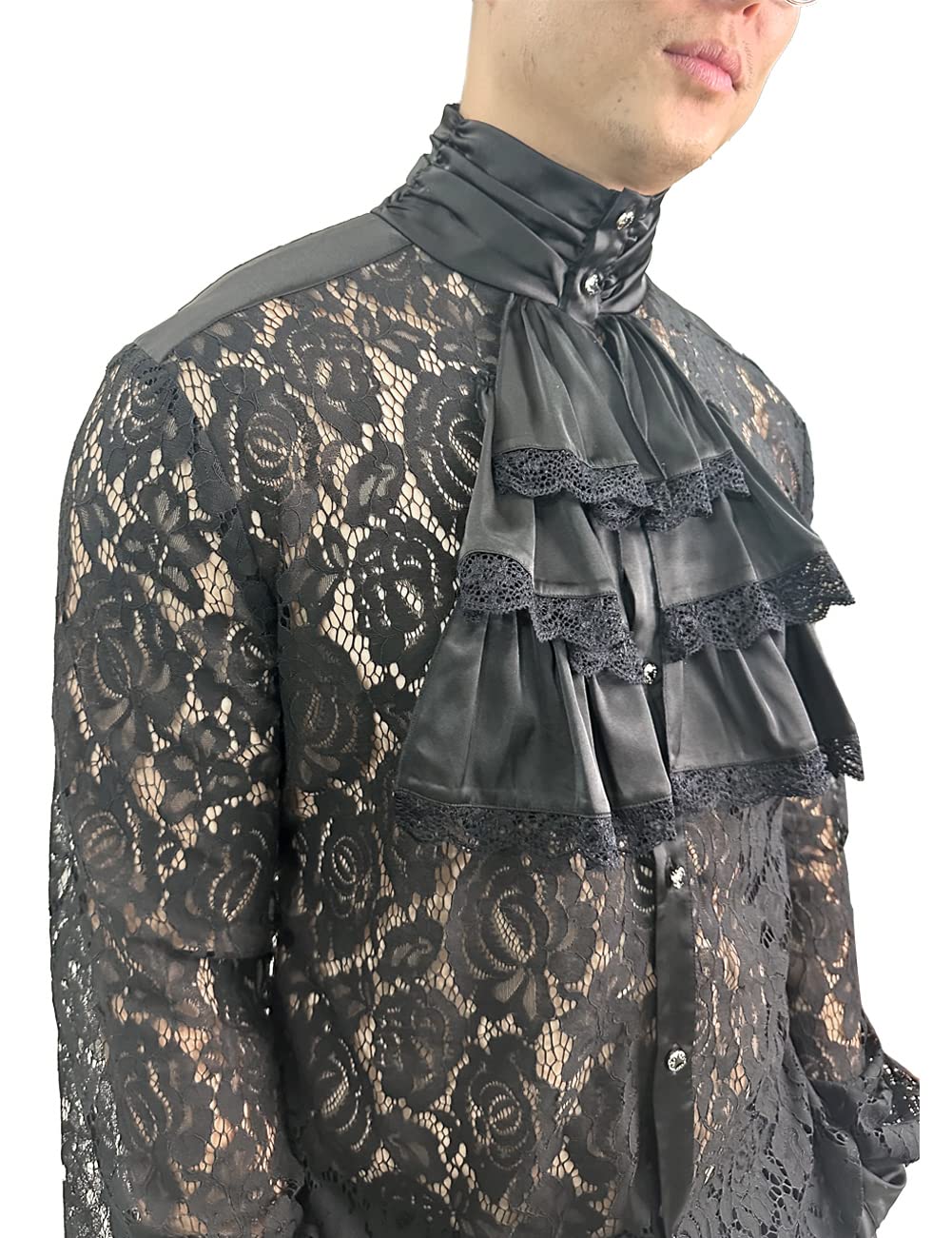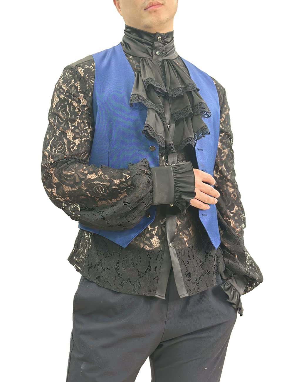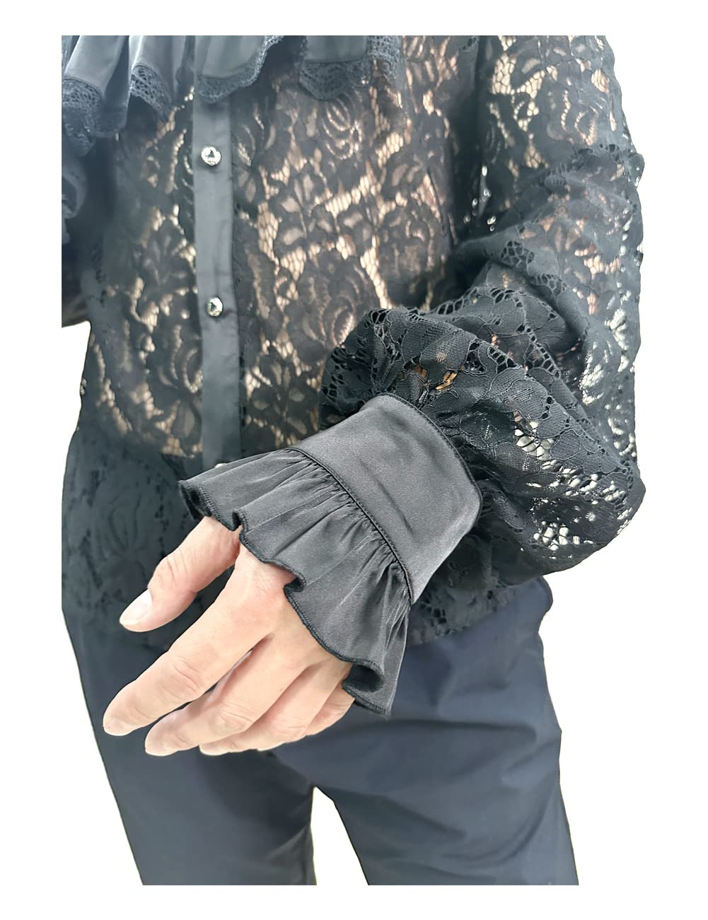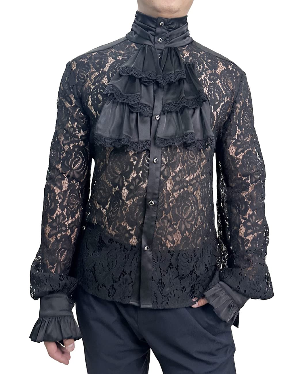 - Feature: classic see through,lace patchwork shirt,long Sleeve , flared cuffs,collar fold,embellish the chest with flounces,Solid Color,steampunk victorian renaissance and pirate Retro Style,Cosplay Costume Shirts For Men,a great match for a medieval jacket.