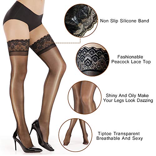 ARRUSA Nylon Shiny Thigh High Stockings,Ultra Shimmery Lace Silicone Sheer Tights,Stay Up lingerie Pantyhose for Women
