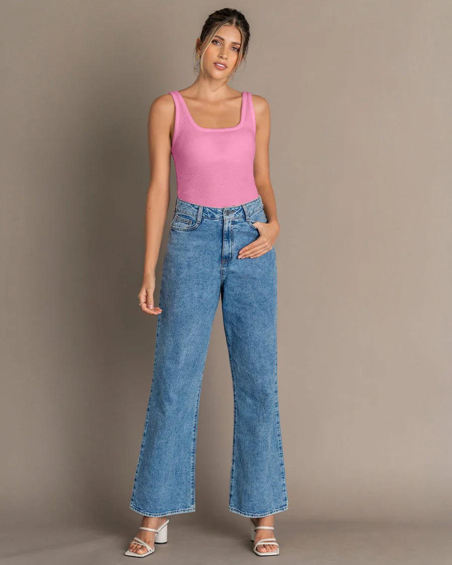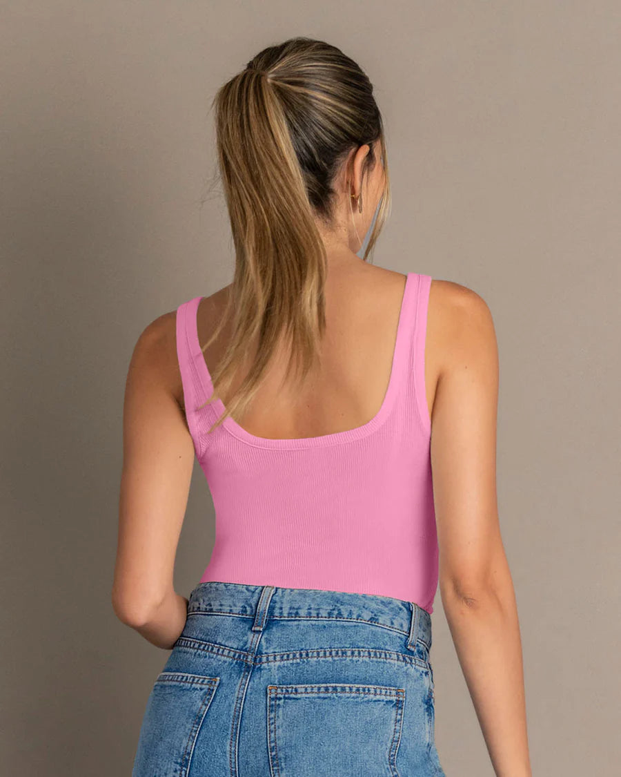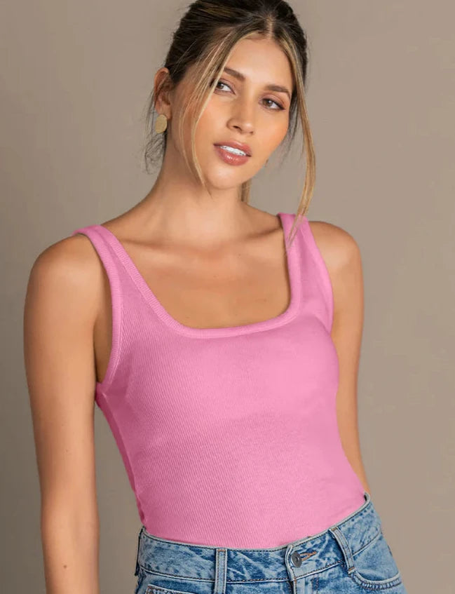A sleeveless t-shirt, perfect for you to feel like your best self. It features a U-neckline, and its square back neckline adds an extra detail that will elevate your look.