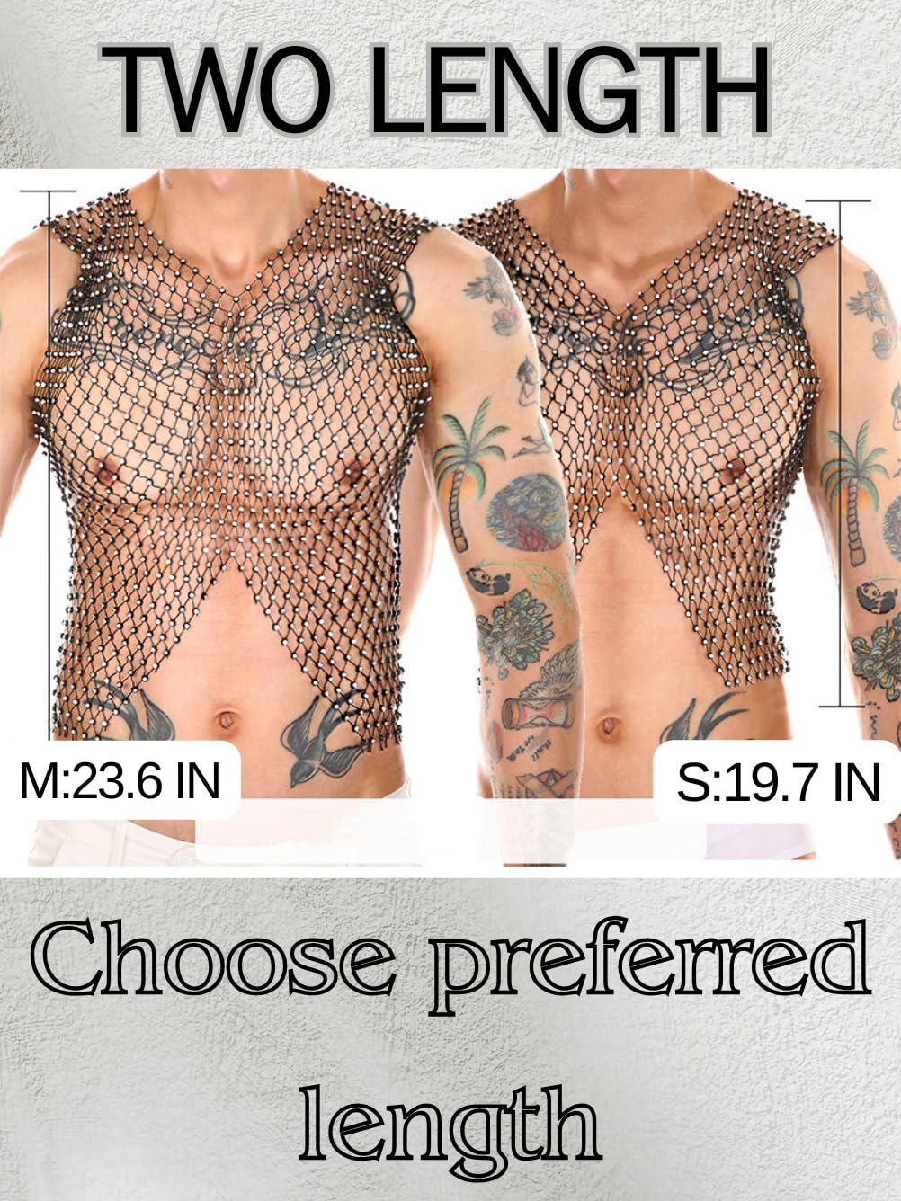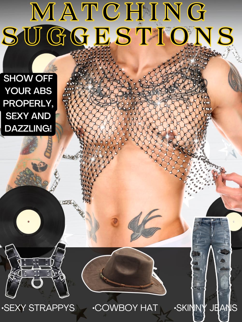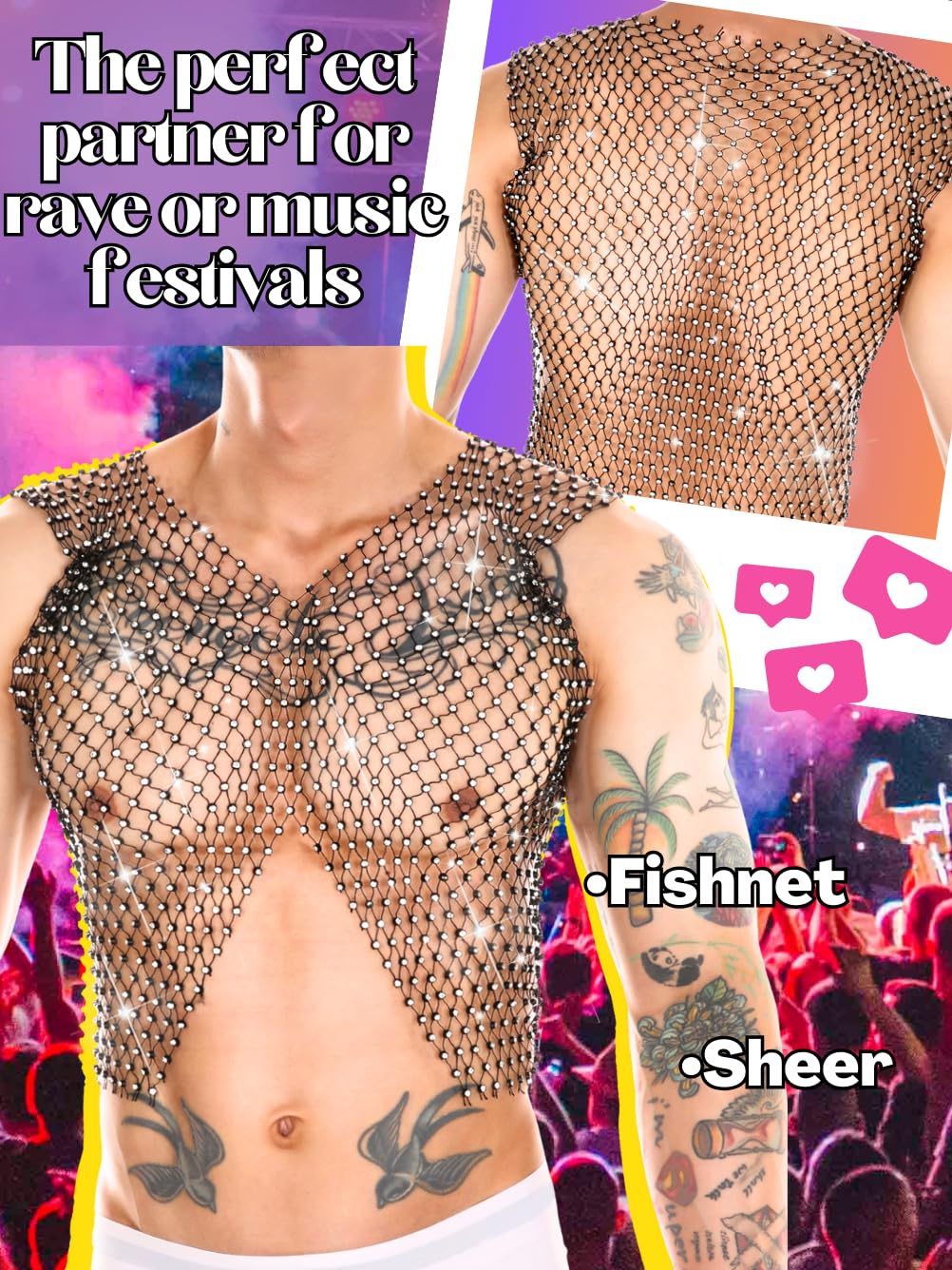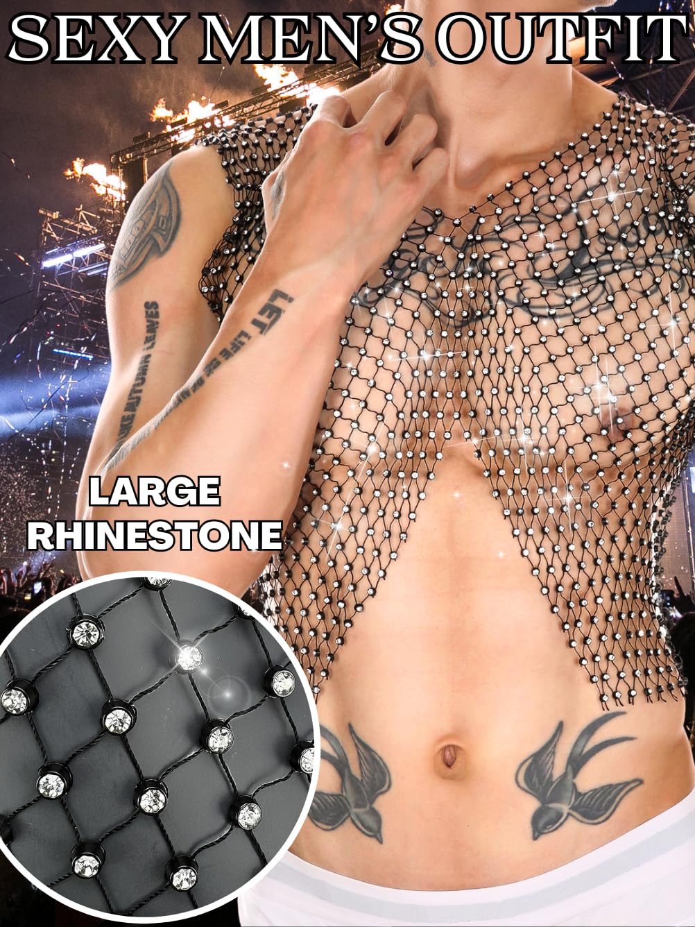 ChiaoLezhee Rhinestone Crop Tops for Men, Rave Outfits Concert Festival, Sexy Mesh Shirts, Sheer Sparkly Fishnet Tanks,Black,Small