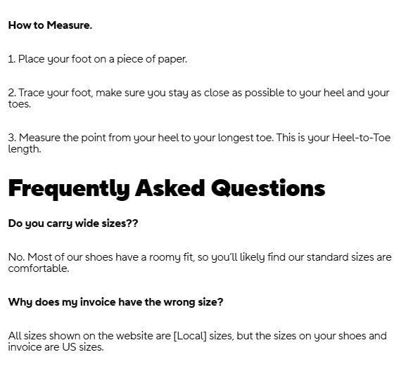 - Tip: If you’re in between sizes, round up. For wide feet order your normal size