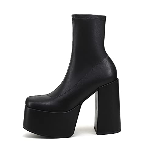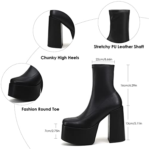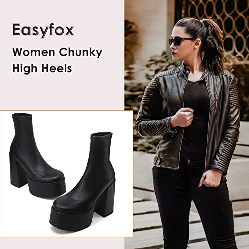 Easyfox Platform Boots for Women Mid Calf Chunky High Heels Ankle Booties Slip on Round Toe Elastic PU Leather Black Shoes size 7
