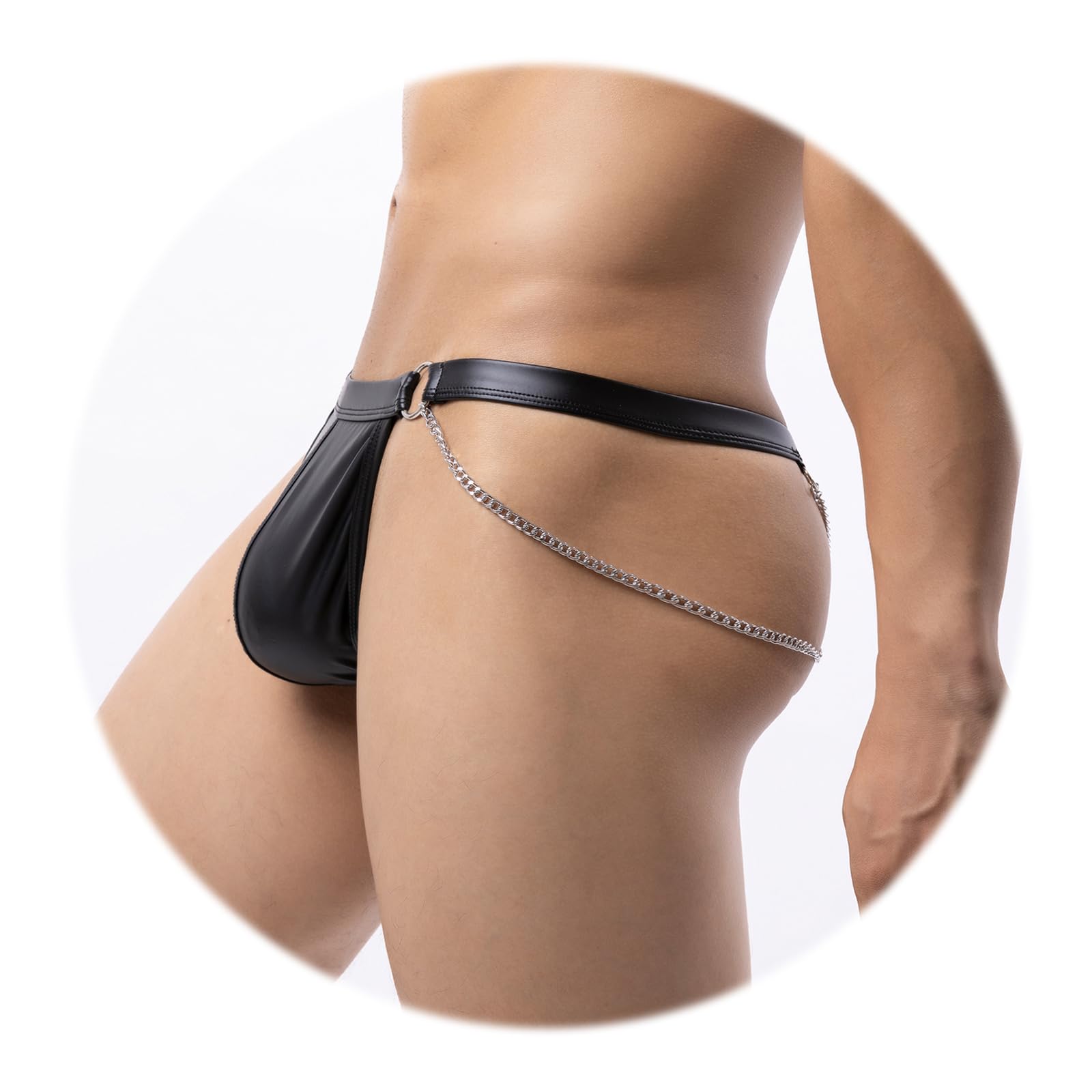 Evankin Men Sexy Leather Thong with Metal Chains Hollow Out T-Back Underwear Low Rise Bikini