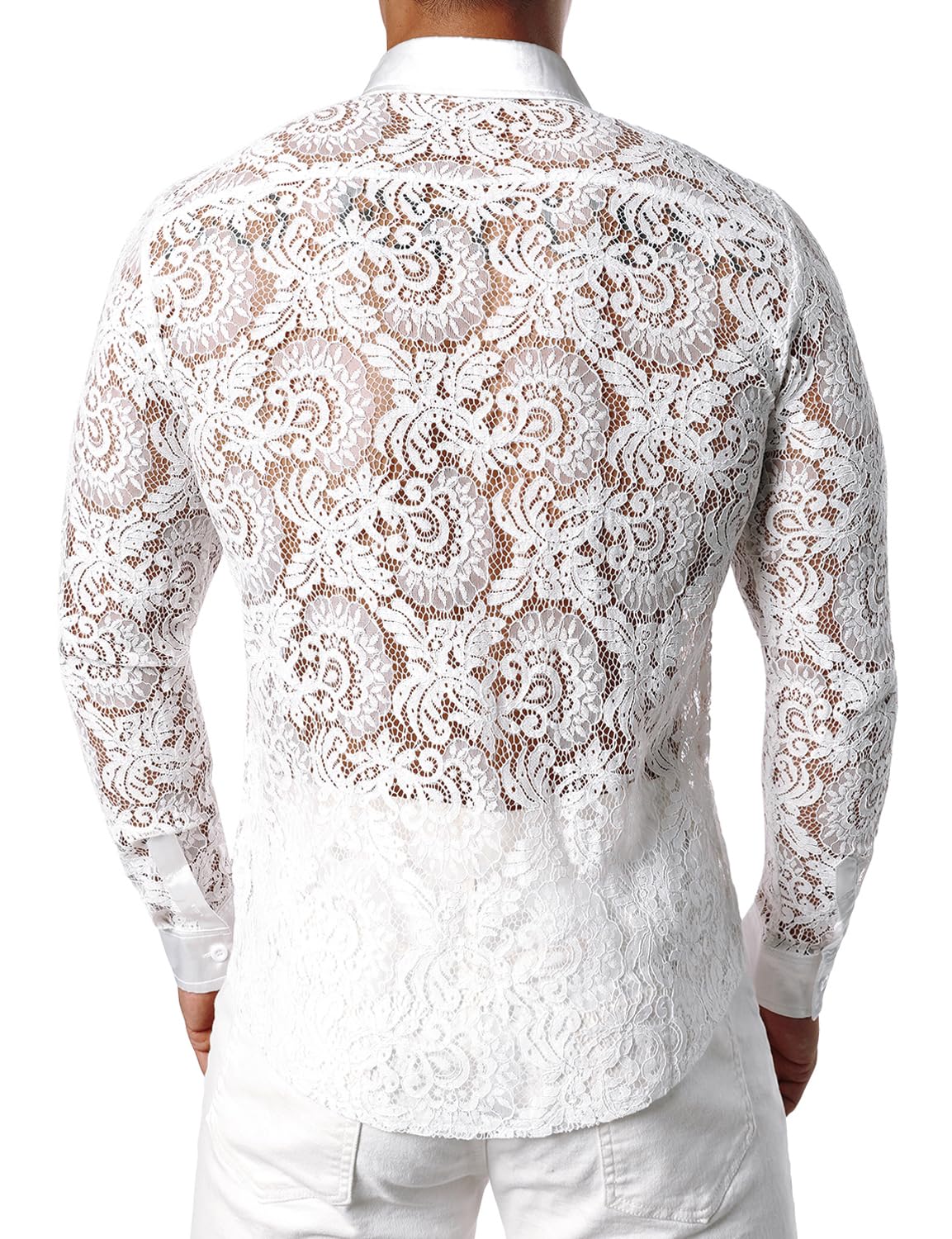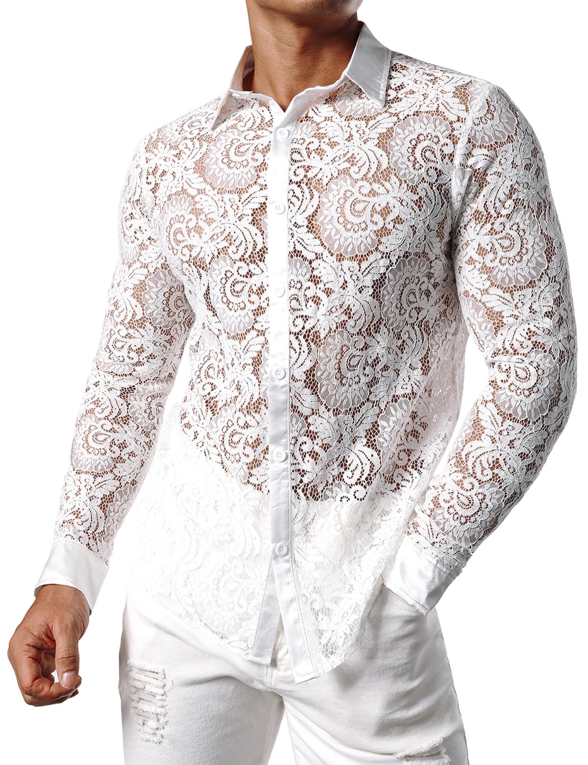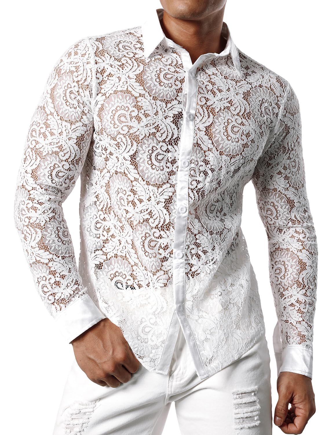 JOGAL Men's See Through Flower Lace Sheer Blouse Long Sleeve Button Down Shirts White XX-Large