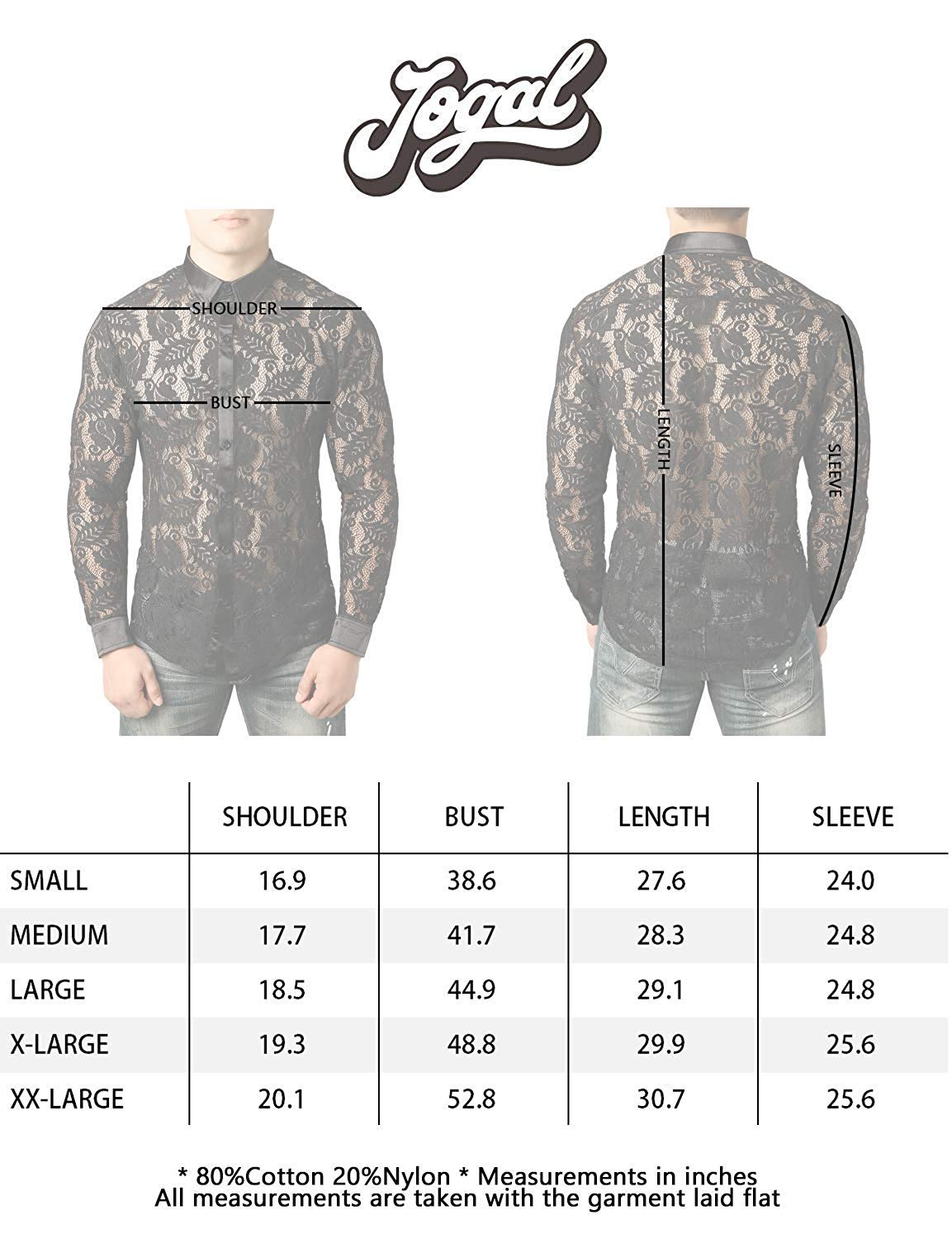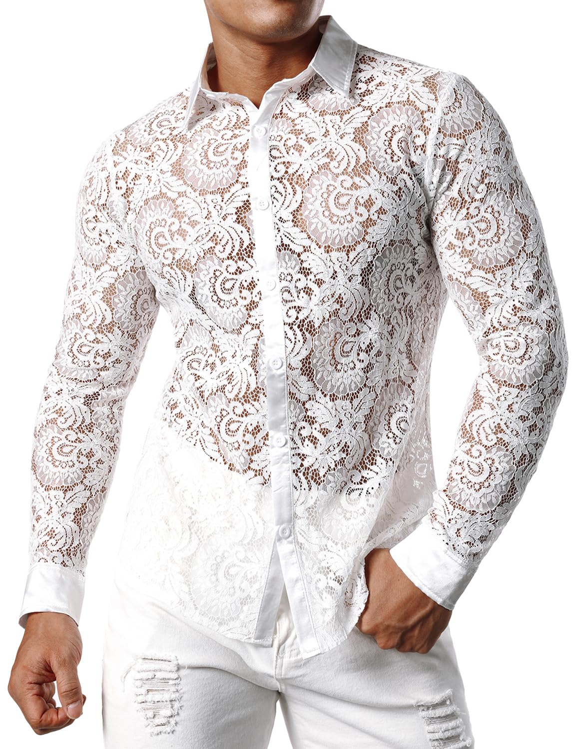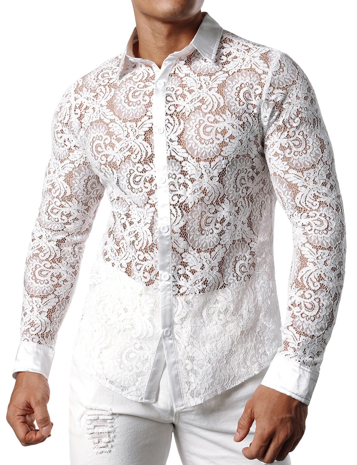 JOGAL Men's See Through Flower Lace Sheer Blouse Long Sleeve Button Down Shirts White XX-Large