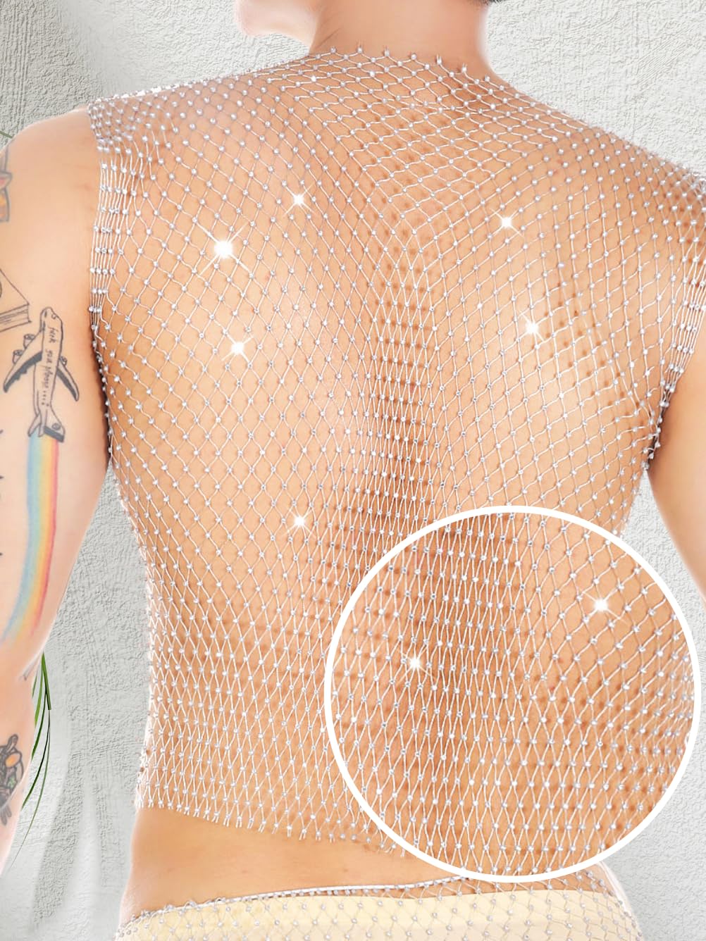 Kaei&Shi Rhinestone Mens Tank Tops Sheer Mesh See Through Fishnet Sparkly Rave Outfit Festival Crop Men Shirt Sexy Club Party,White,Small