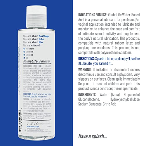 - SILKY SMOOTH: #LubeLife Water-Based Anal Lubricant is for everyone and best used for anal action. The silky-smooth, buttery glide of our water-based lubricant is long-lasting, non-sticky and complements the body’s natural lubrication.
