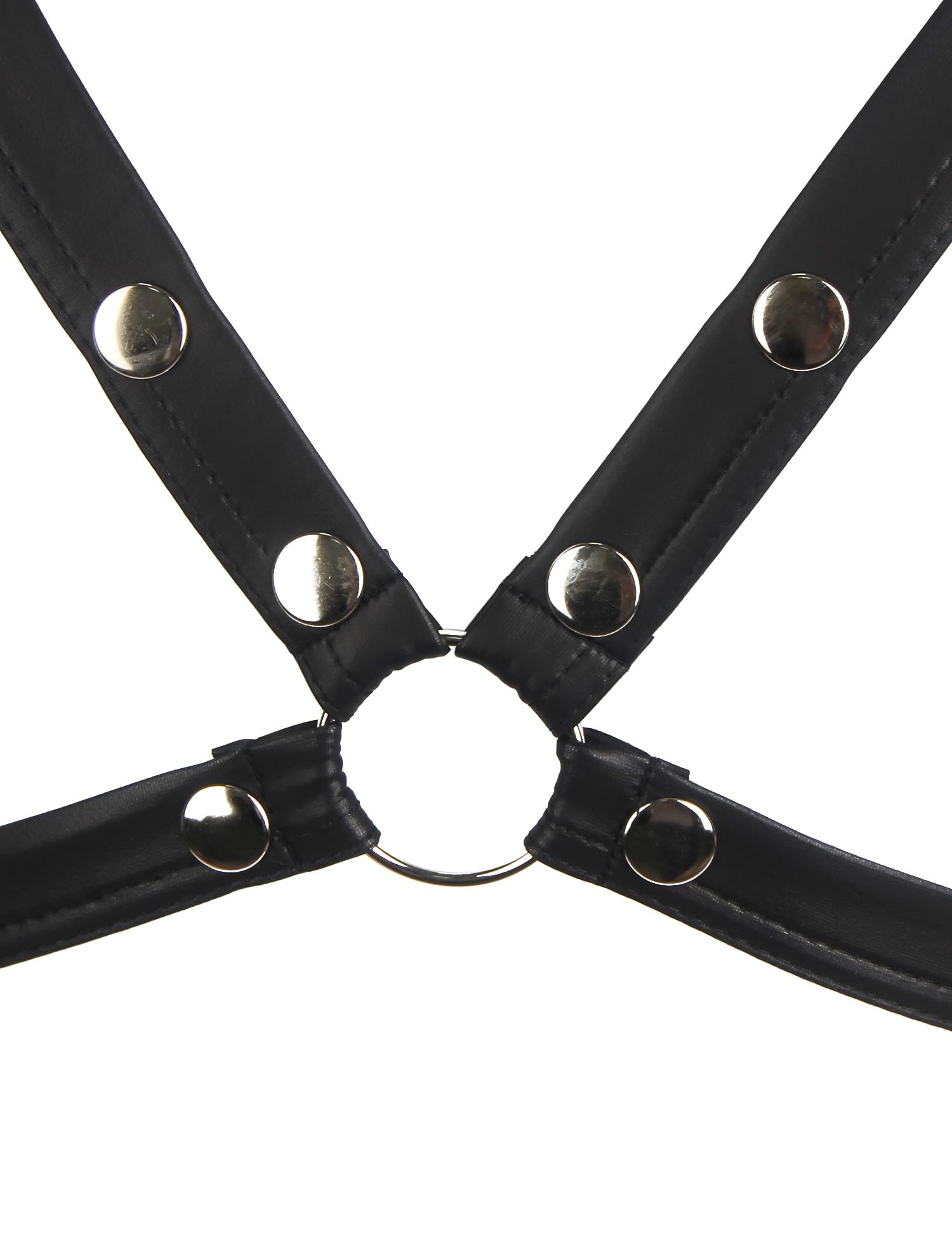 Mens Harness Faux Leather Bondage Sexy Mankini Costume One-piecs Thong Underwear with Jockstrap Bodysuit (Black, XL)