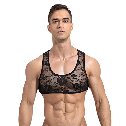 - Men's sexy lace half crop top tanks singlet vest See Through Sleeveless Fishnet Muscle Top Slimming Body Shaper Lace Vest. Perfect for gym, sports training, exercise, weightlifting, jogging, also can wear as a sissy crossdress lingerie for your sepical lover.