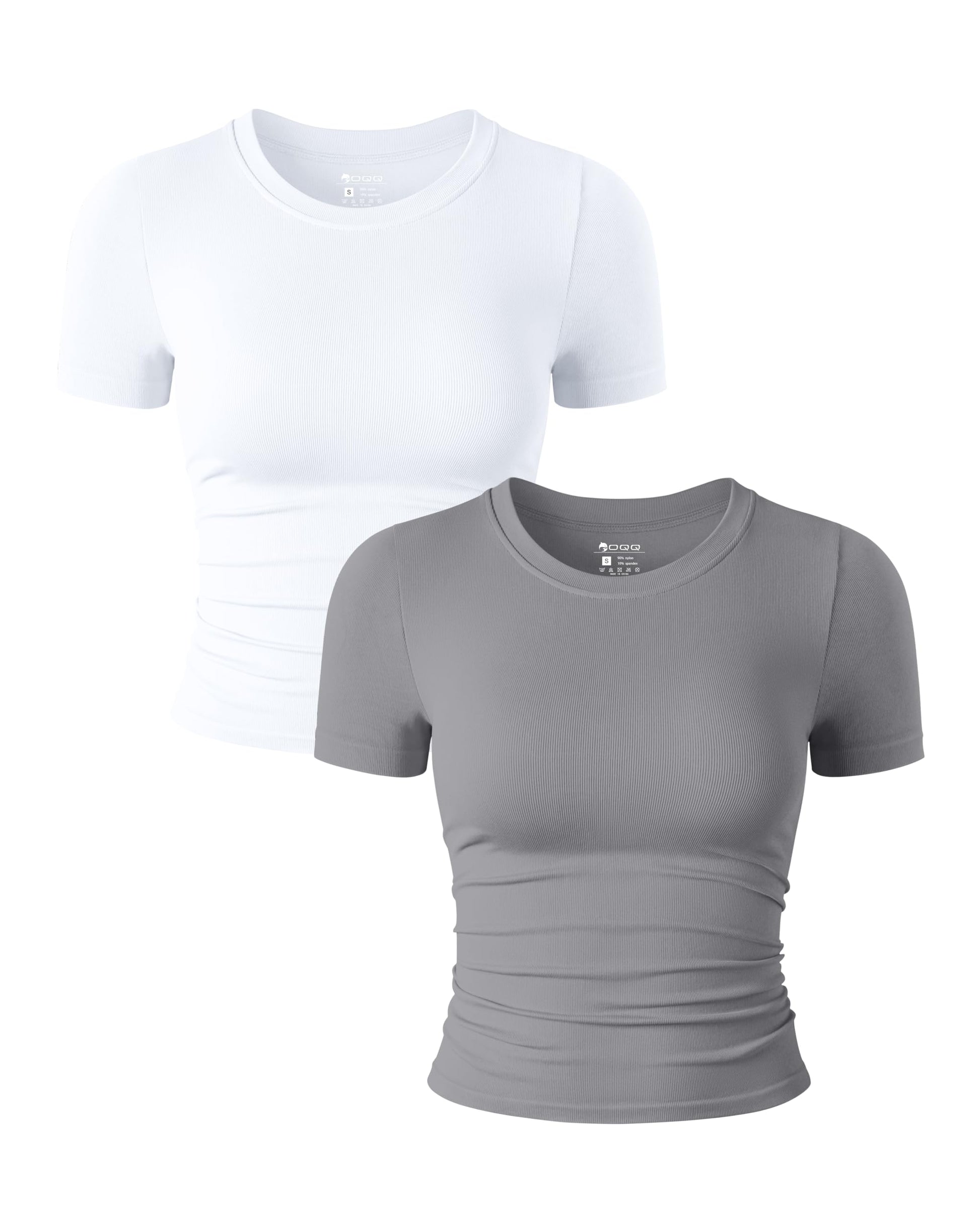 OQQ Womens 2 Piece Shirts Short Sleeve Crew Neck Ruched Stretch Fitted Tee Shirts Crop Tops White Smoke Grey