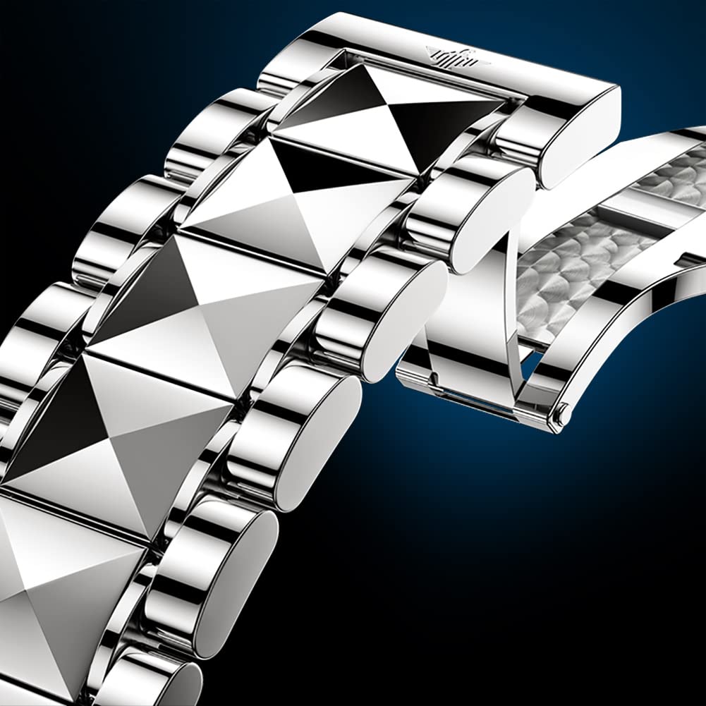 - ⌚Premium Materials and Design:The three-layer anti-reflective sapphire crystal mirror of this mens watch is not only scratch-resistant and wear-resistant, but also effectively prevents glare and fingerprints, Diamond-shaped tungsten steel strap design , adjustable size. Hidden safety butterfly buckle, safe and comfortable to wear.