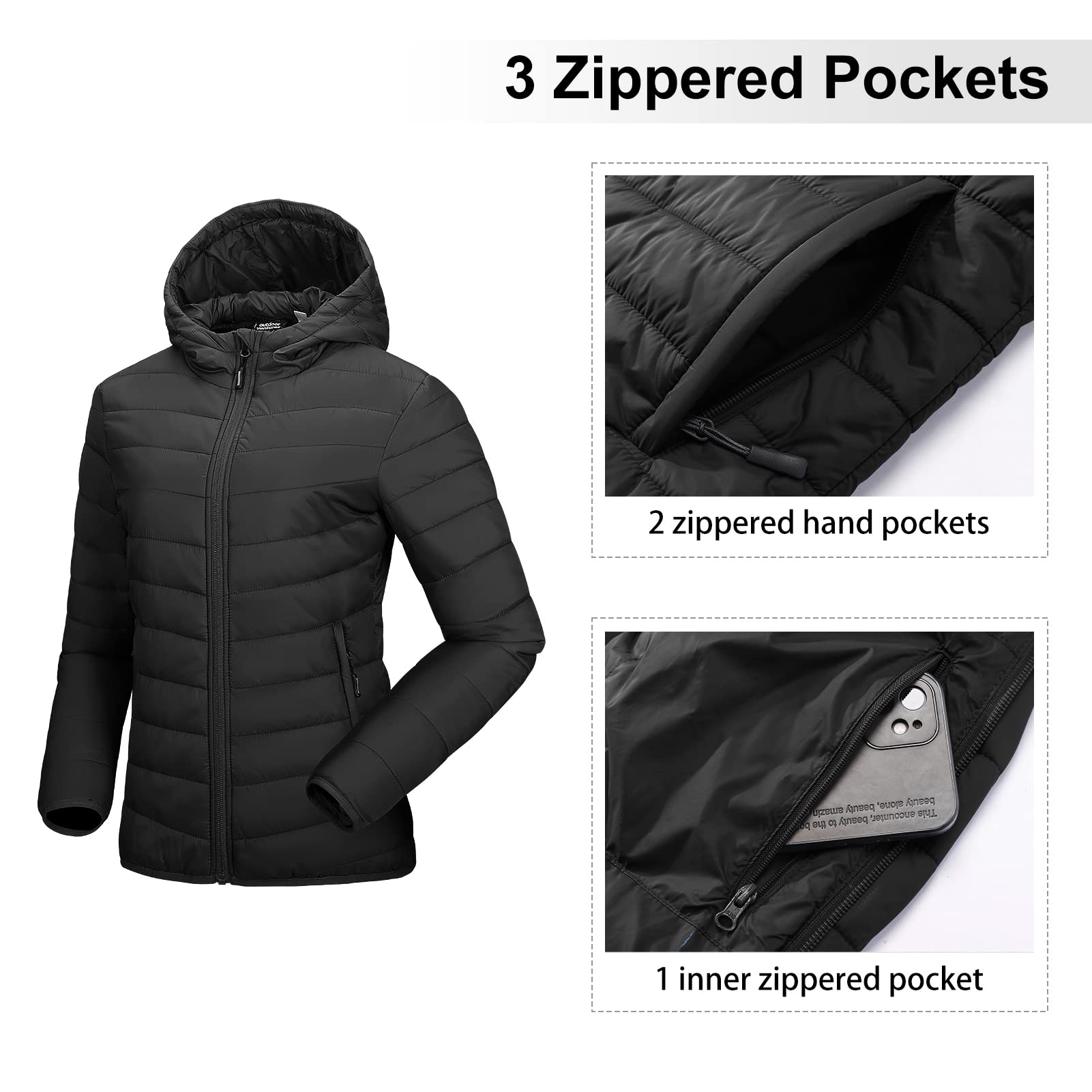 - [Humanized Design] Outdoor Ventures women's hooded puffer jacket includes 2 outside zipper pockets and 1 zipper chest pocket. It is great for storing money, keys, phone, wallet, passport etc, providing great privacy and convenience for you.