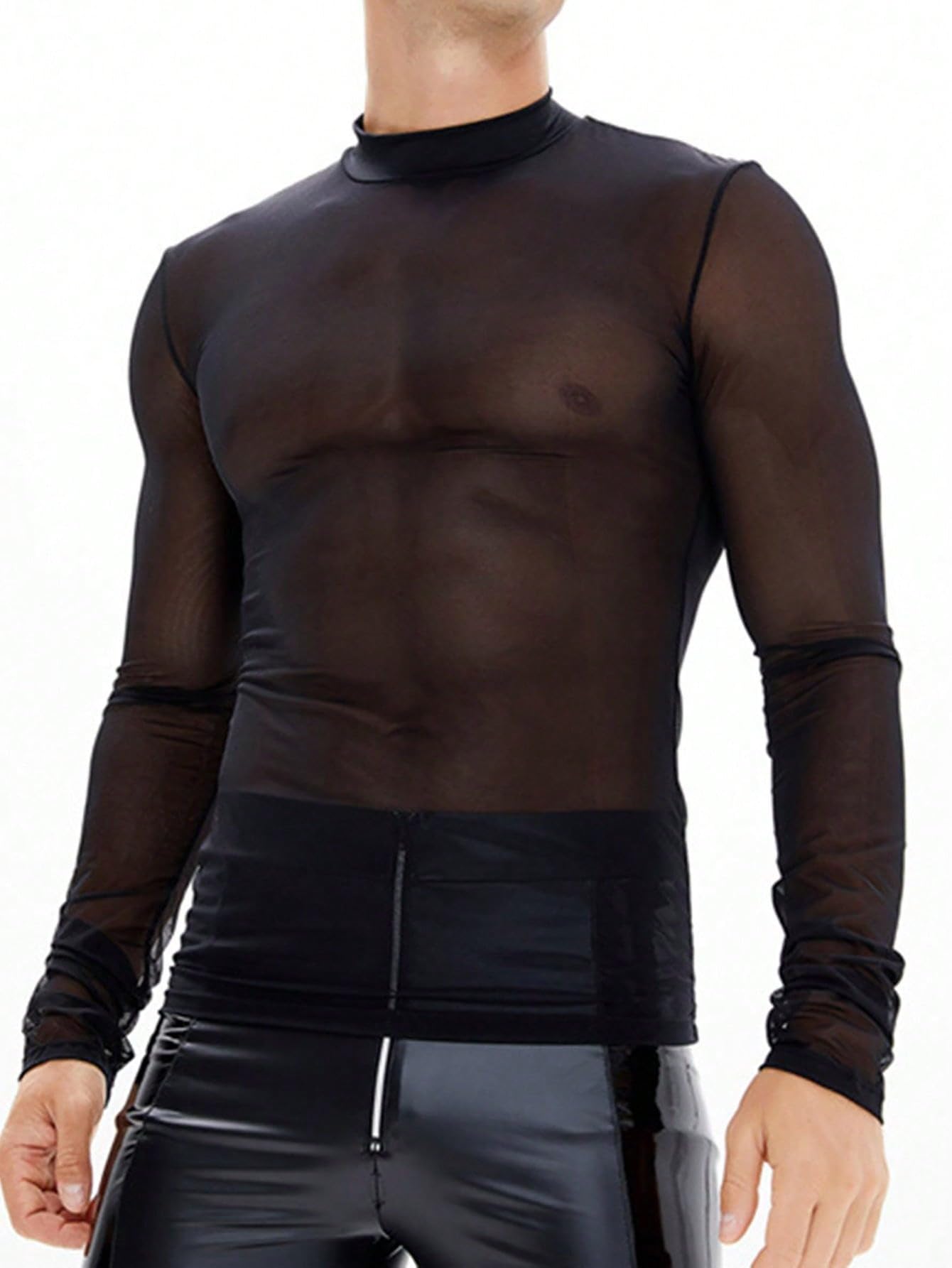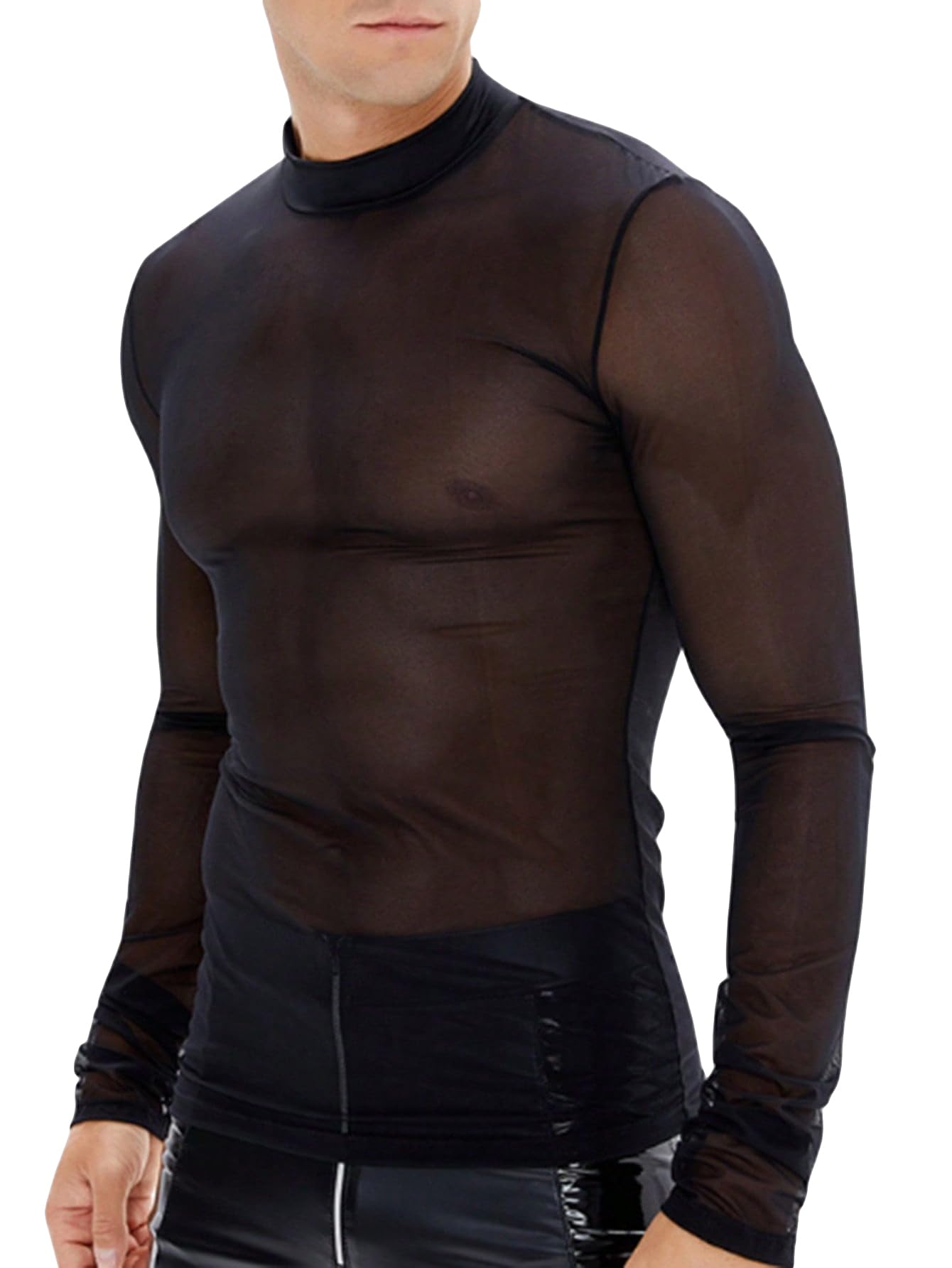 OYOANGLE Men's Sheer Long Sleeve Mock Neck See Through Slim Fit Tee Shirt Tops Clubwear Black L