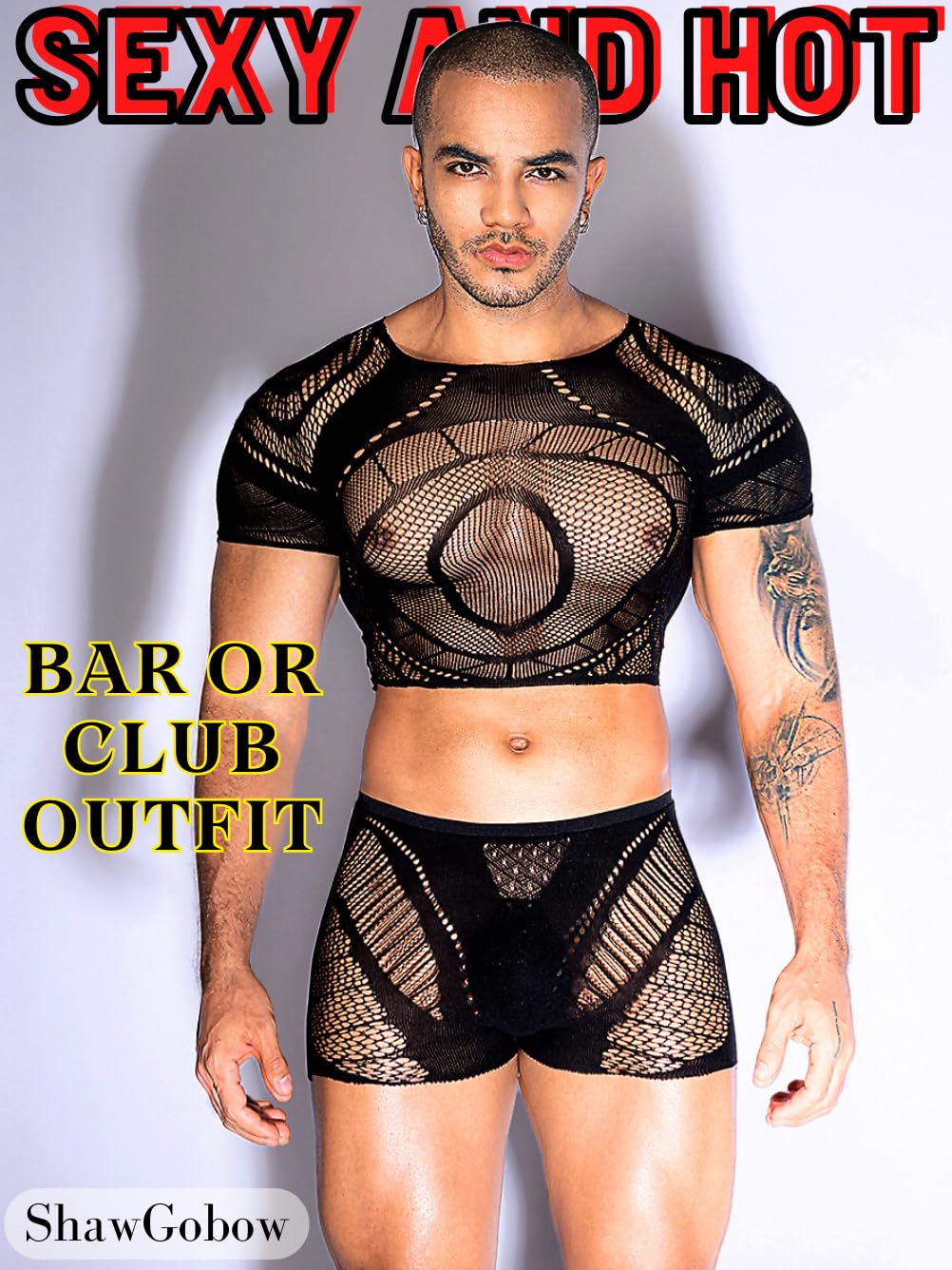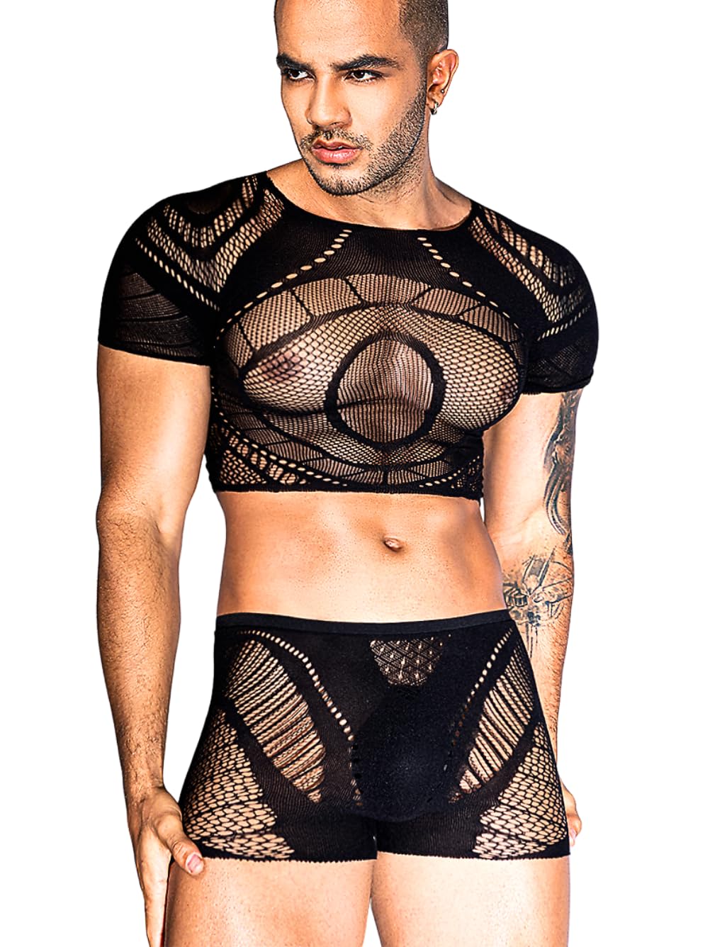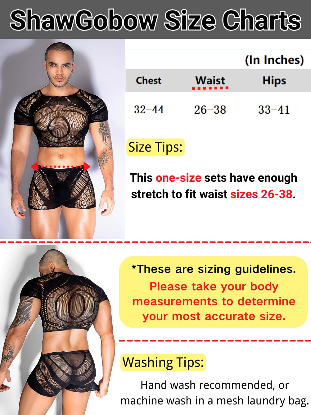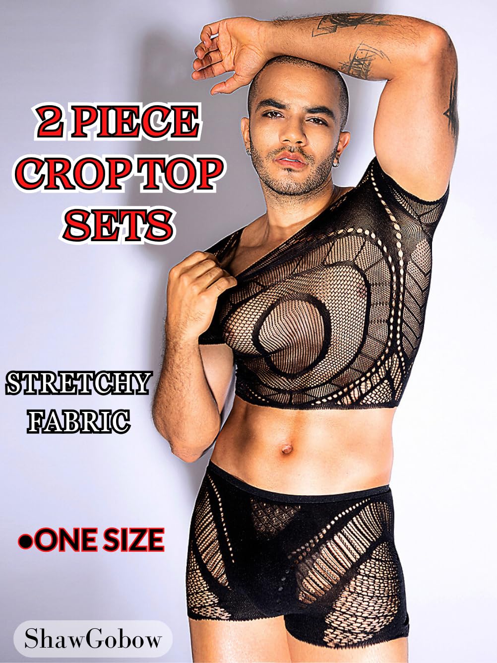 ShawGobow Mesh Crop Tops For Men,Short Sleeve Hollow Out Sheer Fishnet Sexy Top And Shorts Set,2 Piece Rave Outfits Date Night Club Exotic Dancewear Black One Size Fits All