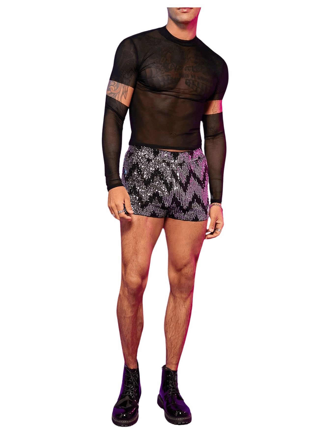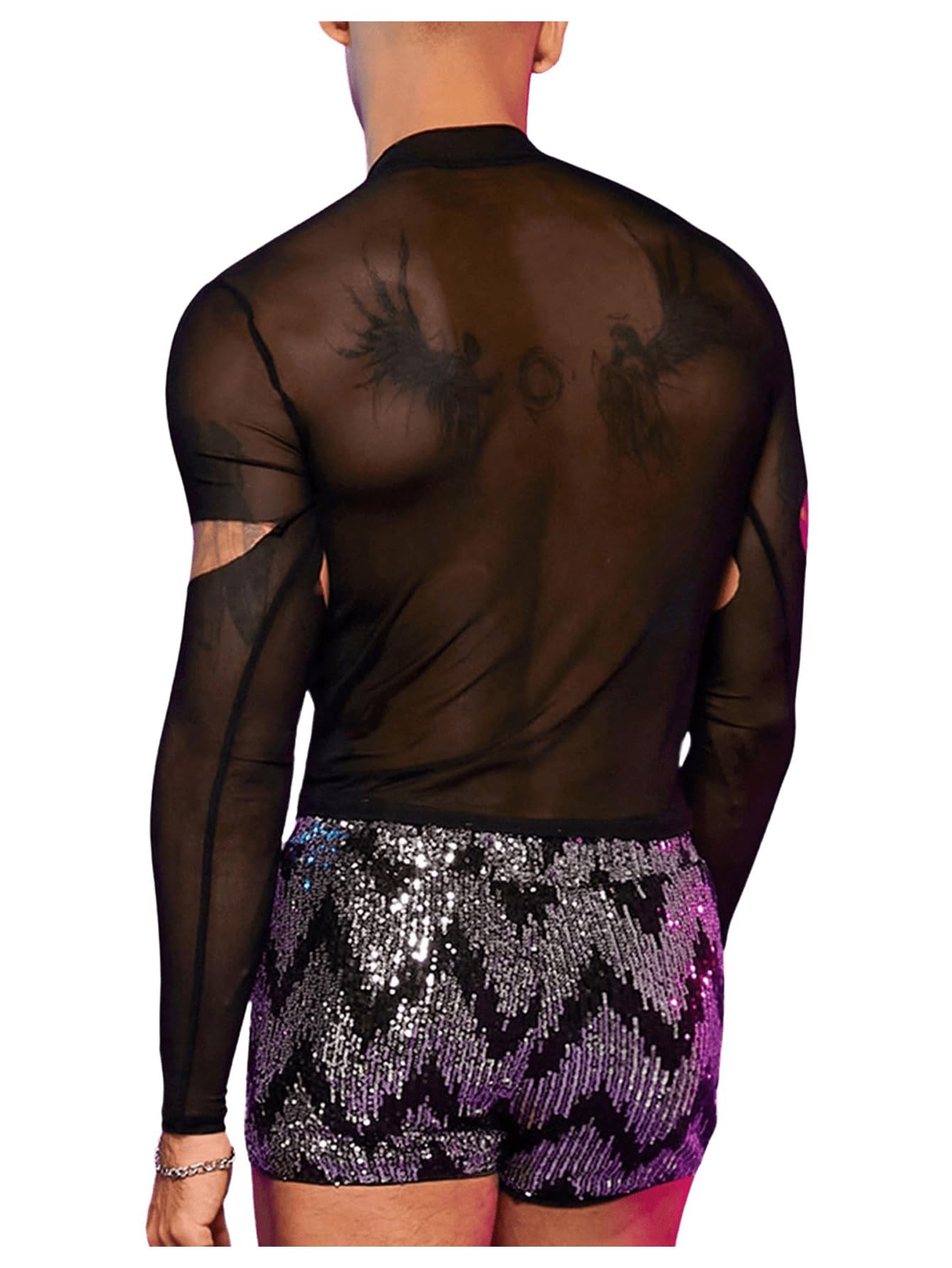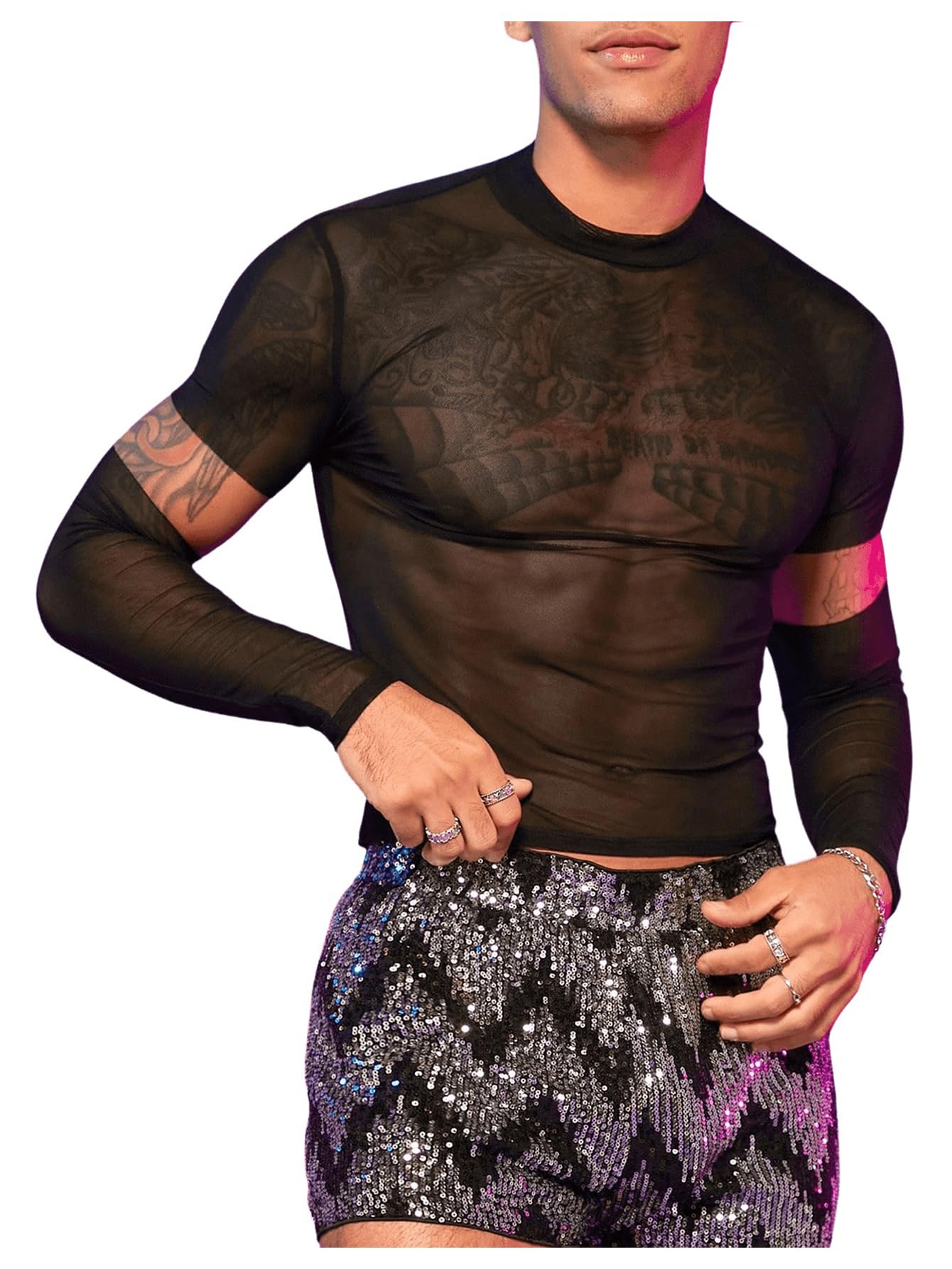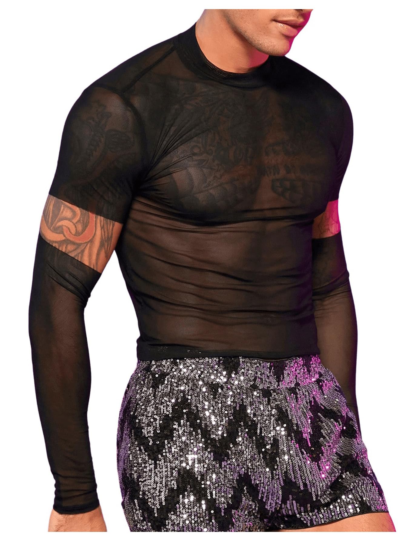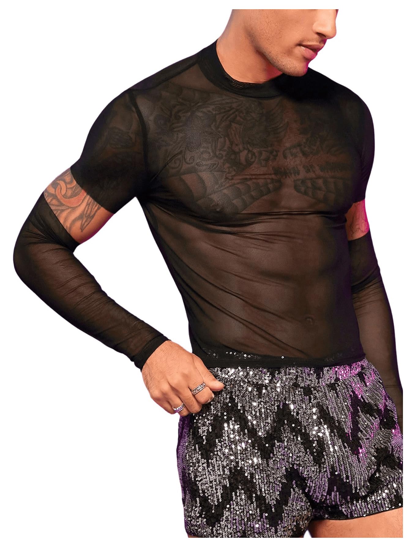 SHENHE Men's Cut Out Sheer Mesh Crewneck Long Sleeve Fitted Crop Tee Shirt Party Top Black M