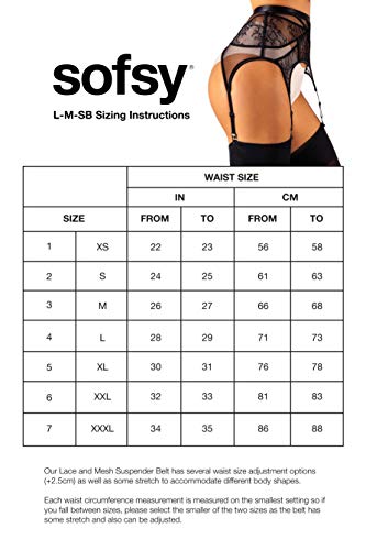 Details: Please note briefs are not included! Garter belt is sold separately from stockings Ladies: Want lingerie that makes you feel sexy and Confident — for that special someone or just for yourself? Unlike strappy garter belts that are made just for skinny supermodels, the sofsy classic Lace and Mesh Suspender Belt / Garter Belt was made for beautiful women of all shapes and sizes! It not only looks gorgeous; it's made of strong, elasticized lace and mesh that slims your waist, hips & tummy. This retro-style garter belt is comfortable, too! While cheap products have waistbands that are thin and tight, ours is wider, with soft material that won't cut into your skin. Plus, it retains its elasticity over time so you always have a great fit. The sofsy Lace and Mesh Suspender Belt / Garter Belt is made of quality materials, including durable metal clips that aren't prone to breakage like other brands. No need to worry about your belt coming undone! This high-waisted belt is designed to be worn with our stretchy thigh-high stockings. Wear them together for work, your wedding, casual outings, evenings on the town, or romantic encounters. Feel your sexy, feminine best — even if no one knows you're wearing it but you! Also makes a fun holiday or anytime gift for your wife or girlfriend. Click "Add to cart" to buy now! Lace and mesh garter belt waist Size X-Small 22-23 inches Small 24-25 inches Medium 26-27 inches Large 28-29 inches X-Large 30-31 inches XX-Large 32-33 inches XXX-Large 34-35 inches If you fall between sizes, please select the smaller of the two sizes as the belt has some stretch and also can be adjusted up to +1 inch