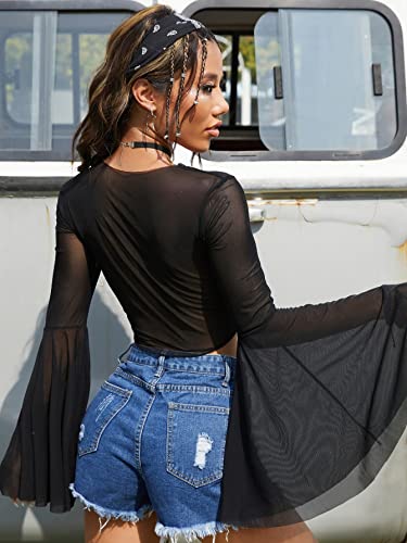 Verdusa Women's Tie Front Bell Long Sleeve Blouse Sheer Mesh Crop Top Black L