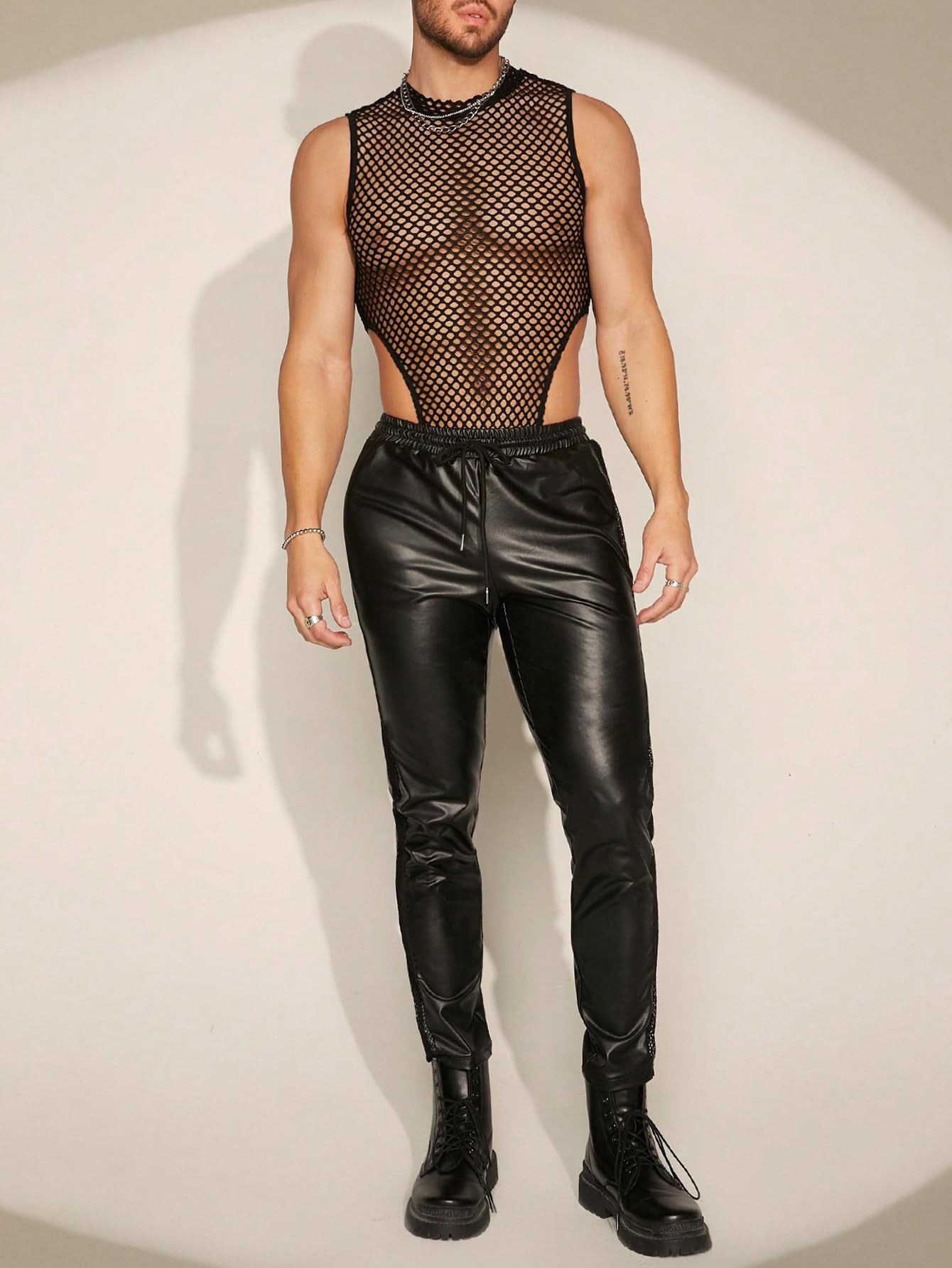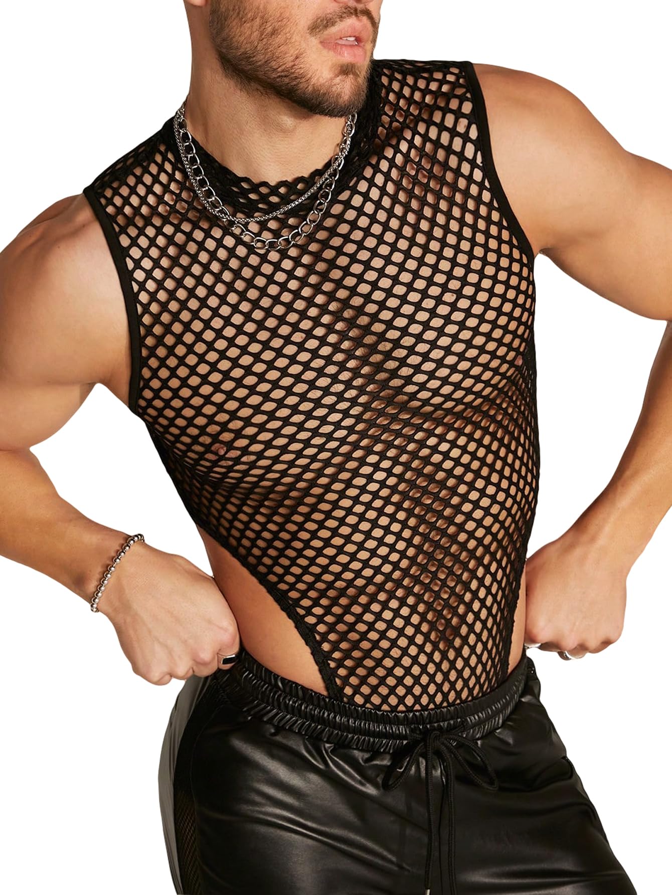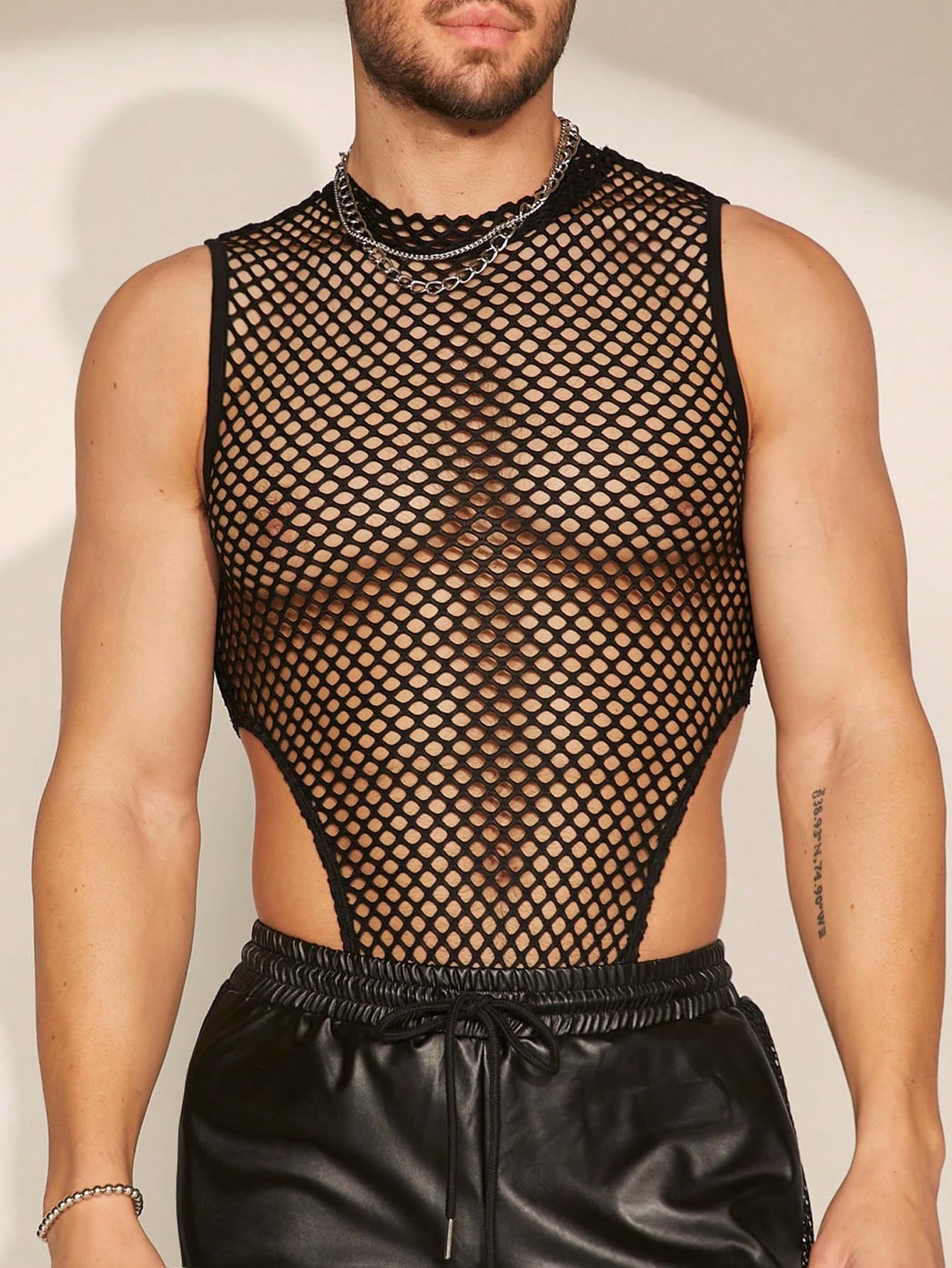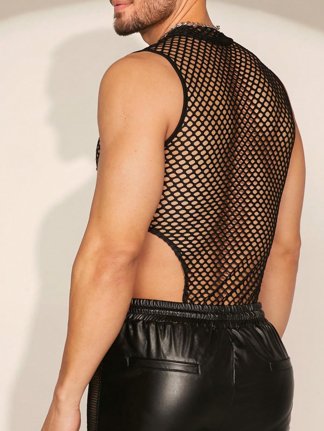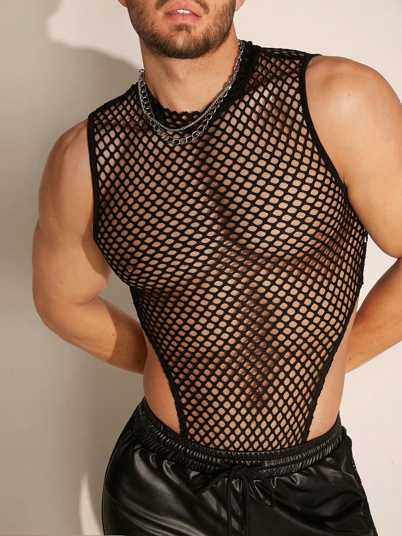 WDIRARA Men's Fishnet Mesh Mock Neck Vest Top Sleeveless Sheer Party Tank Tops Bodysuit Black Medium