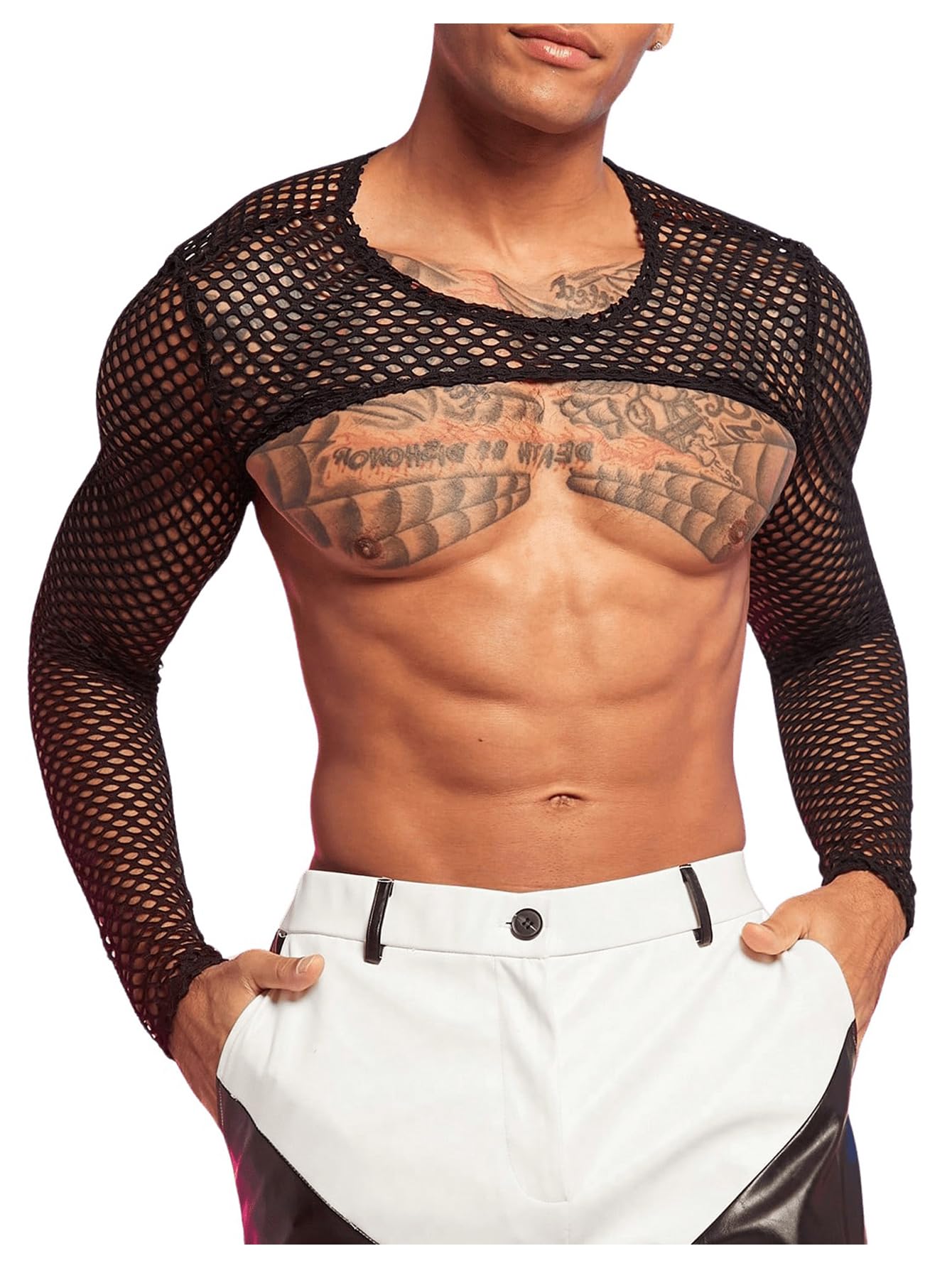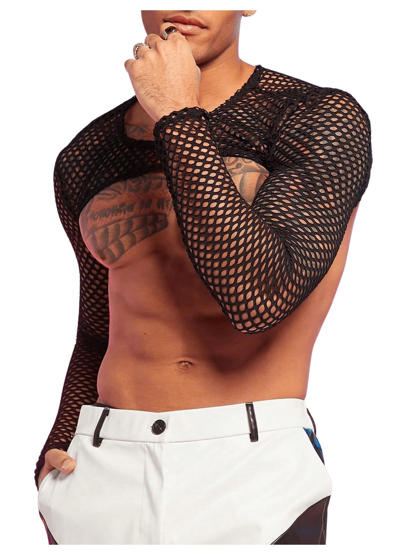 - Features: mesh, fishnet, sheer, long sleeve, cropped, round neck, hollow out, see through, slim fit, party t shirts for men