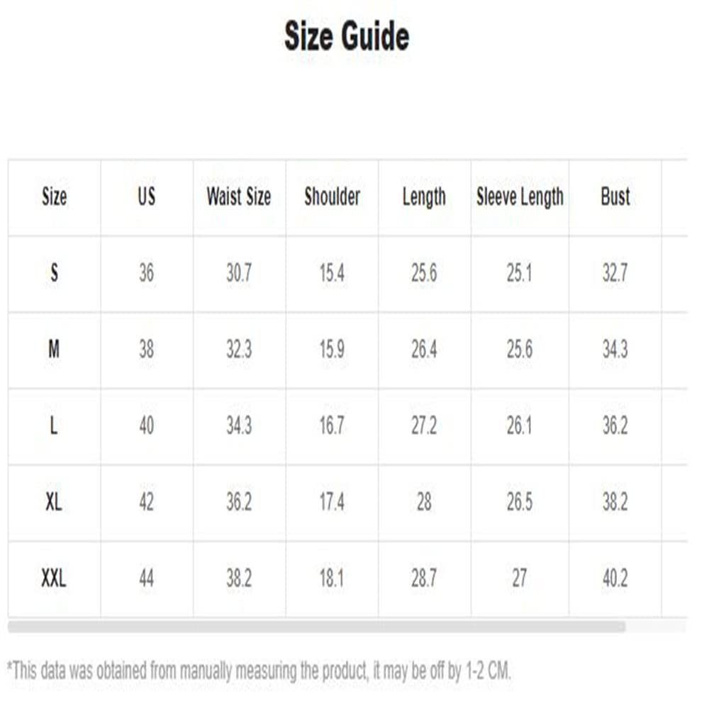 Large: Waist Size: 34.3", Shoulder: 16.7", Length: 27.2", Sleeve Length: 26.1", Bust: 36.2", Cuff: 7.6"