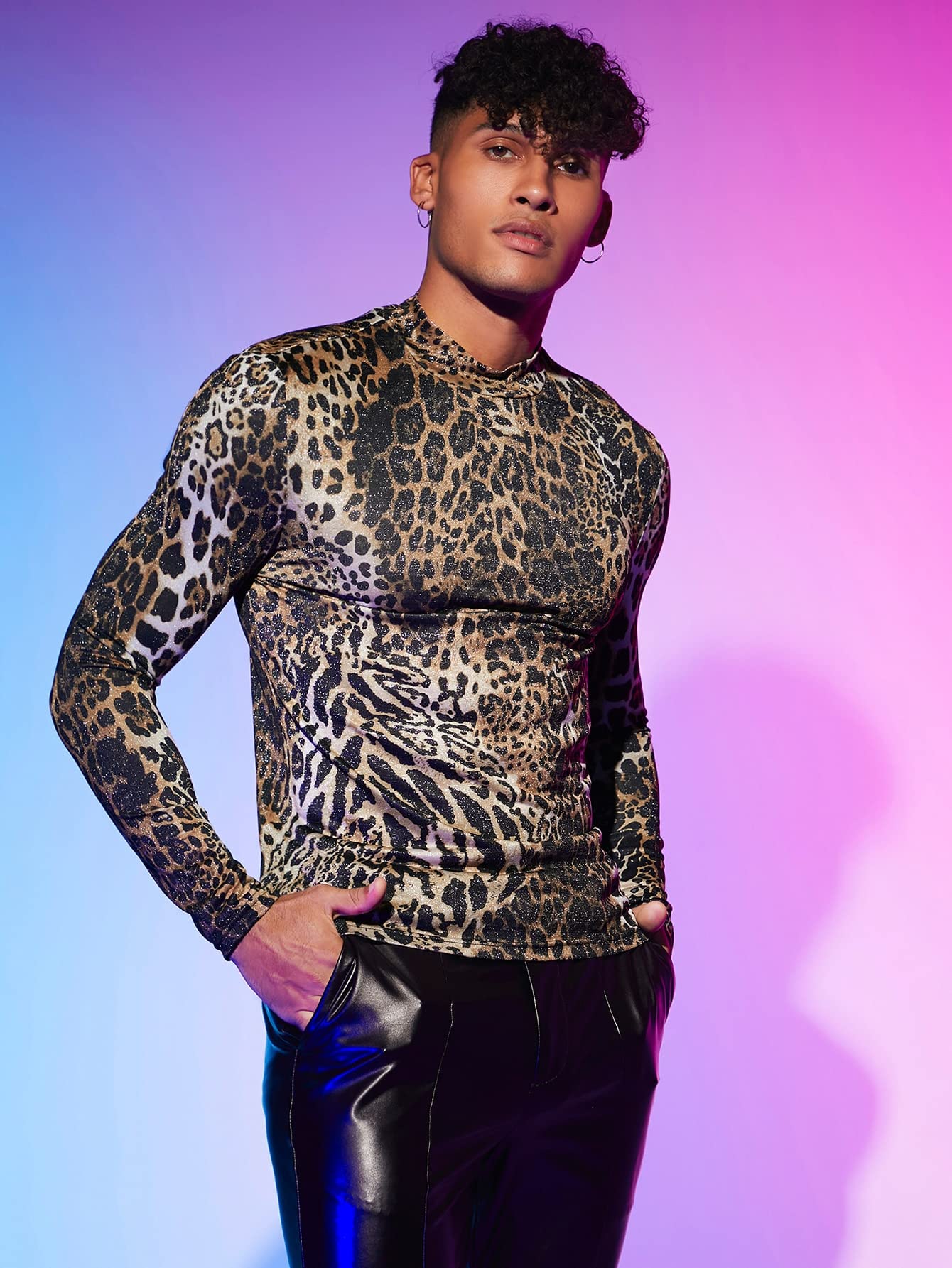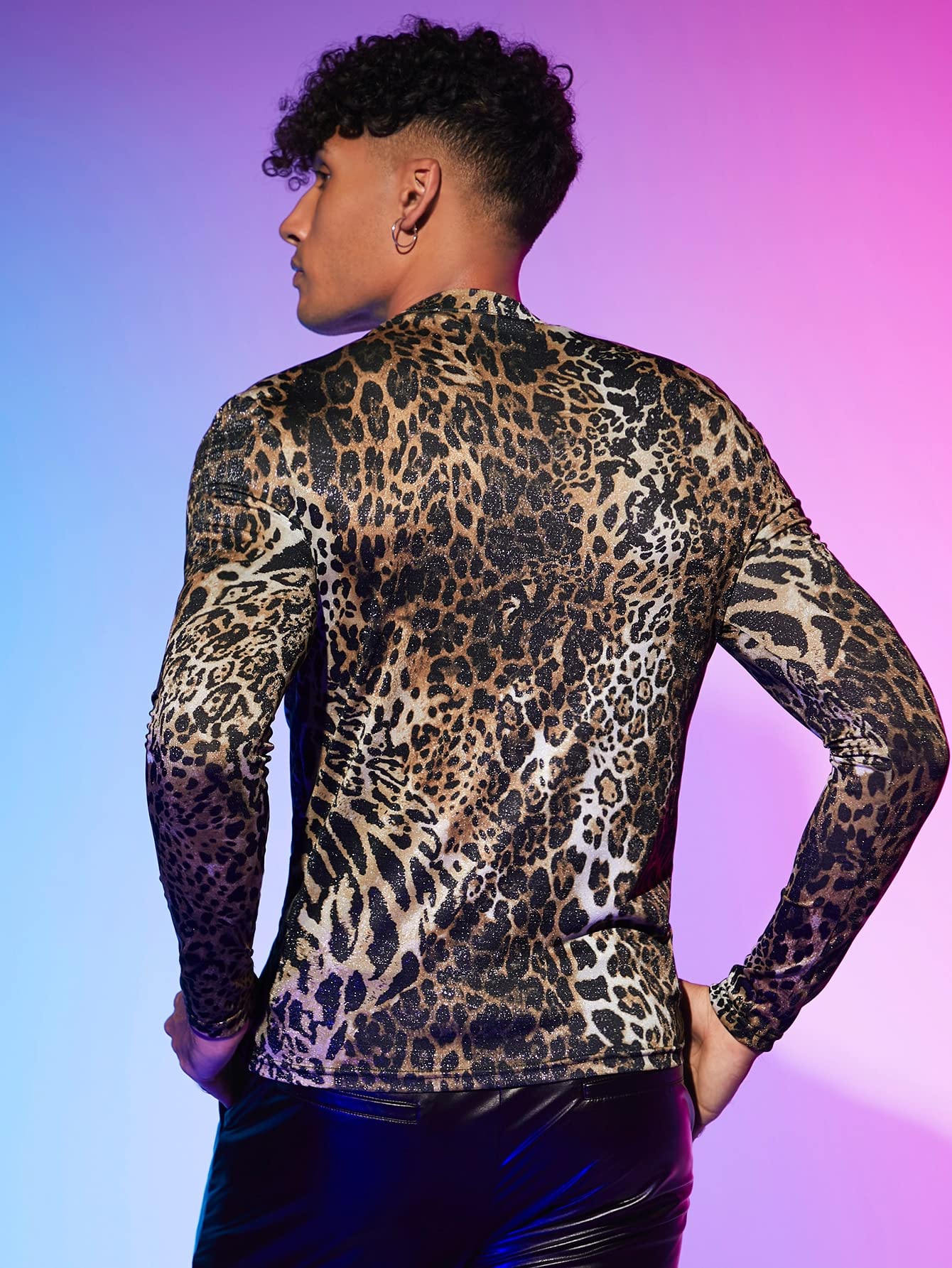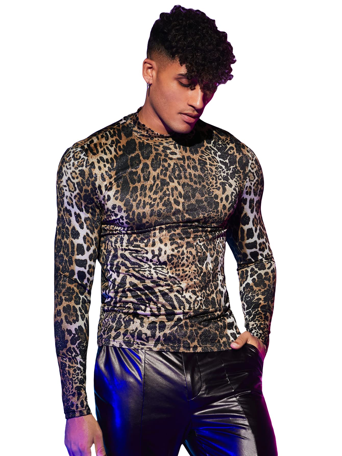 - Features: leopard print, stand collar, long sleeve, fitted tops for men