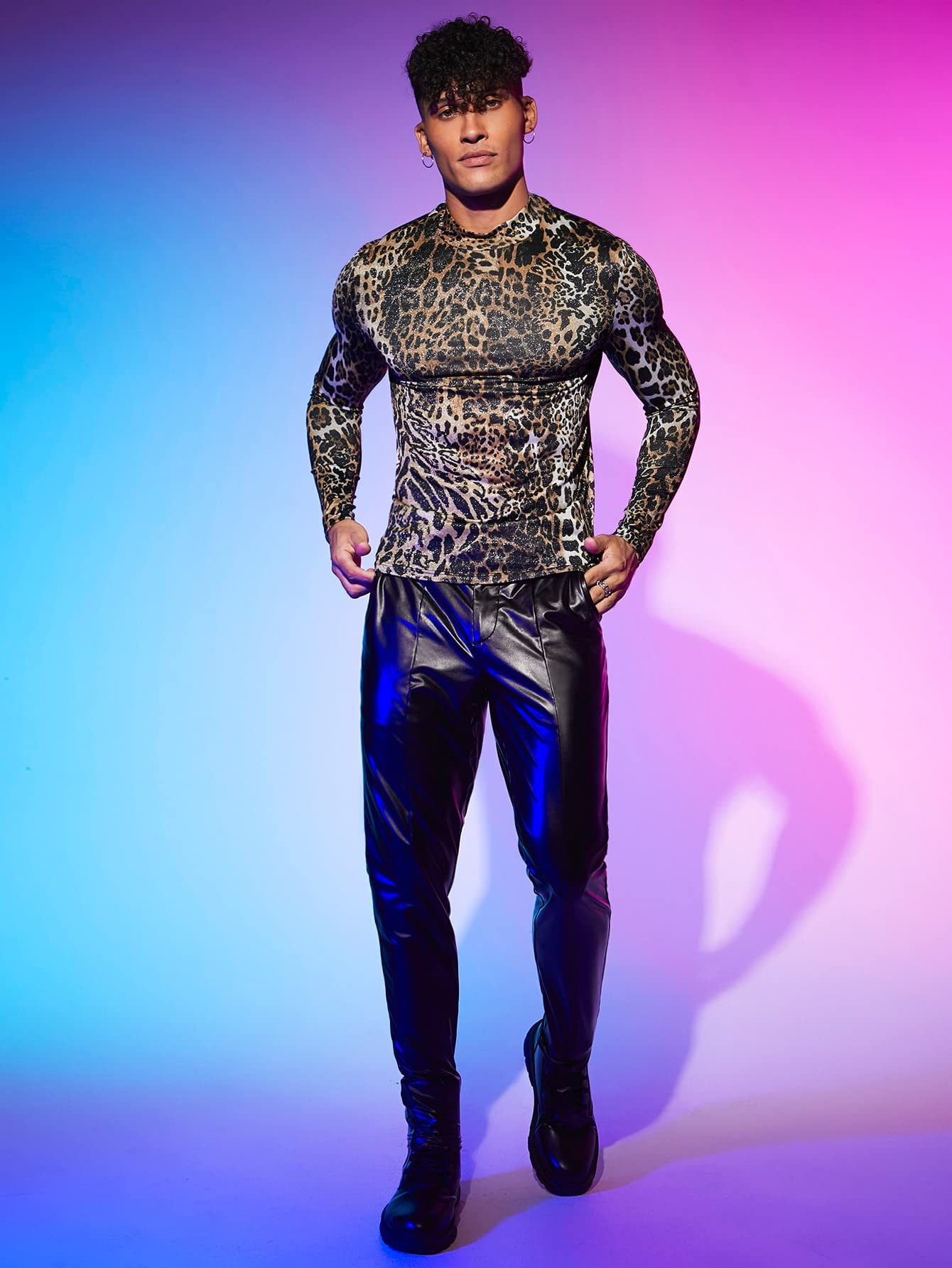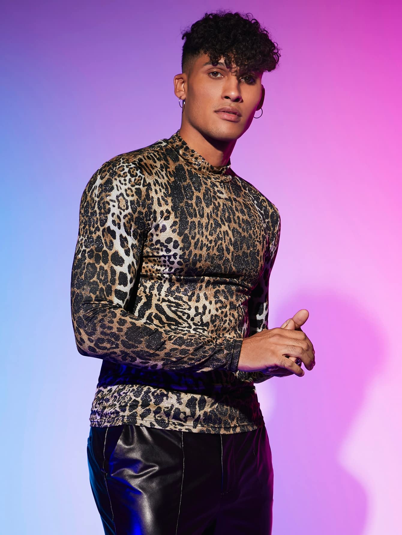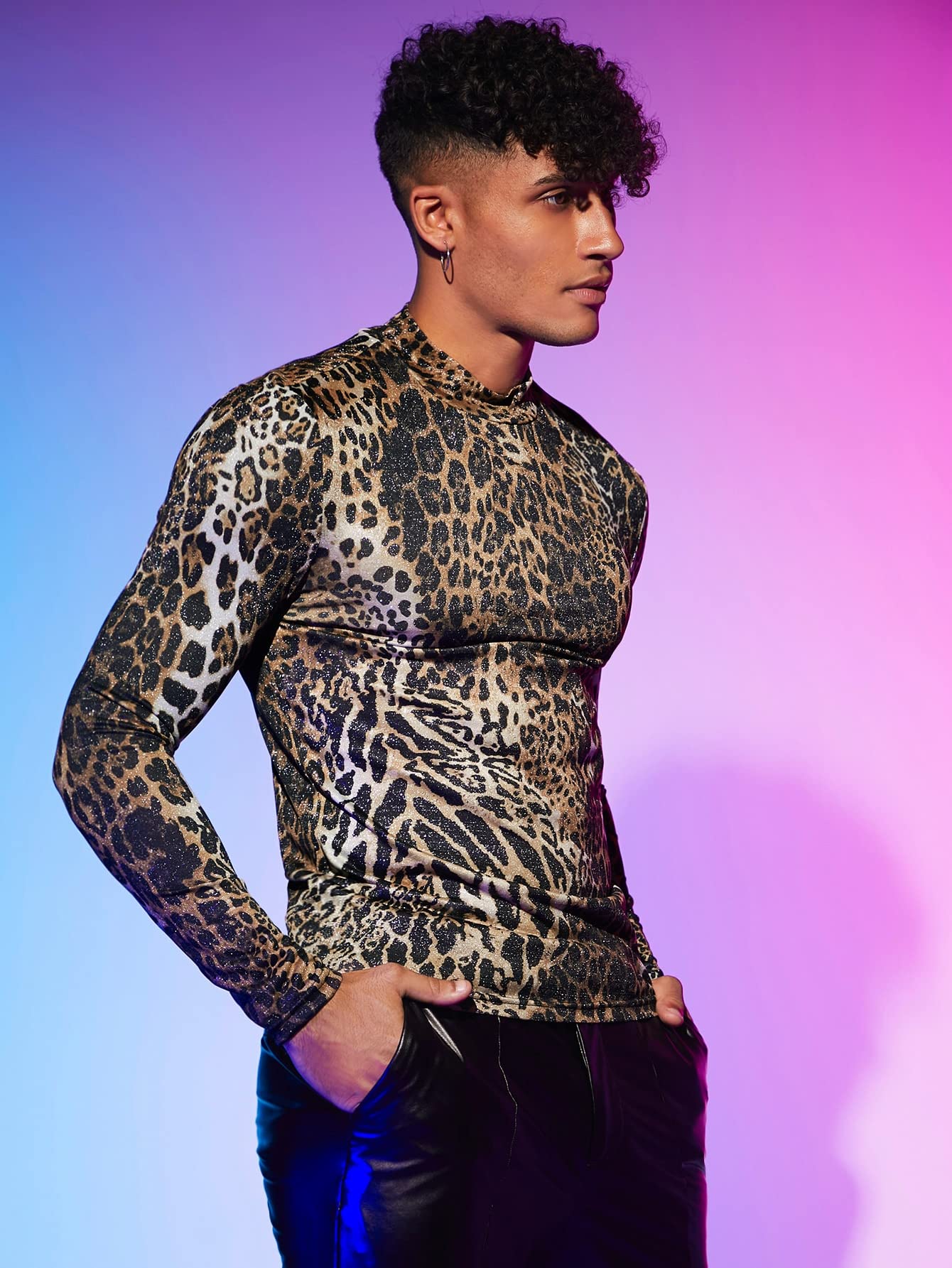 - Features: leopard print, stand collar, long sleeve, fitted tops for men
