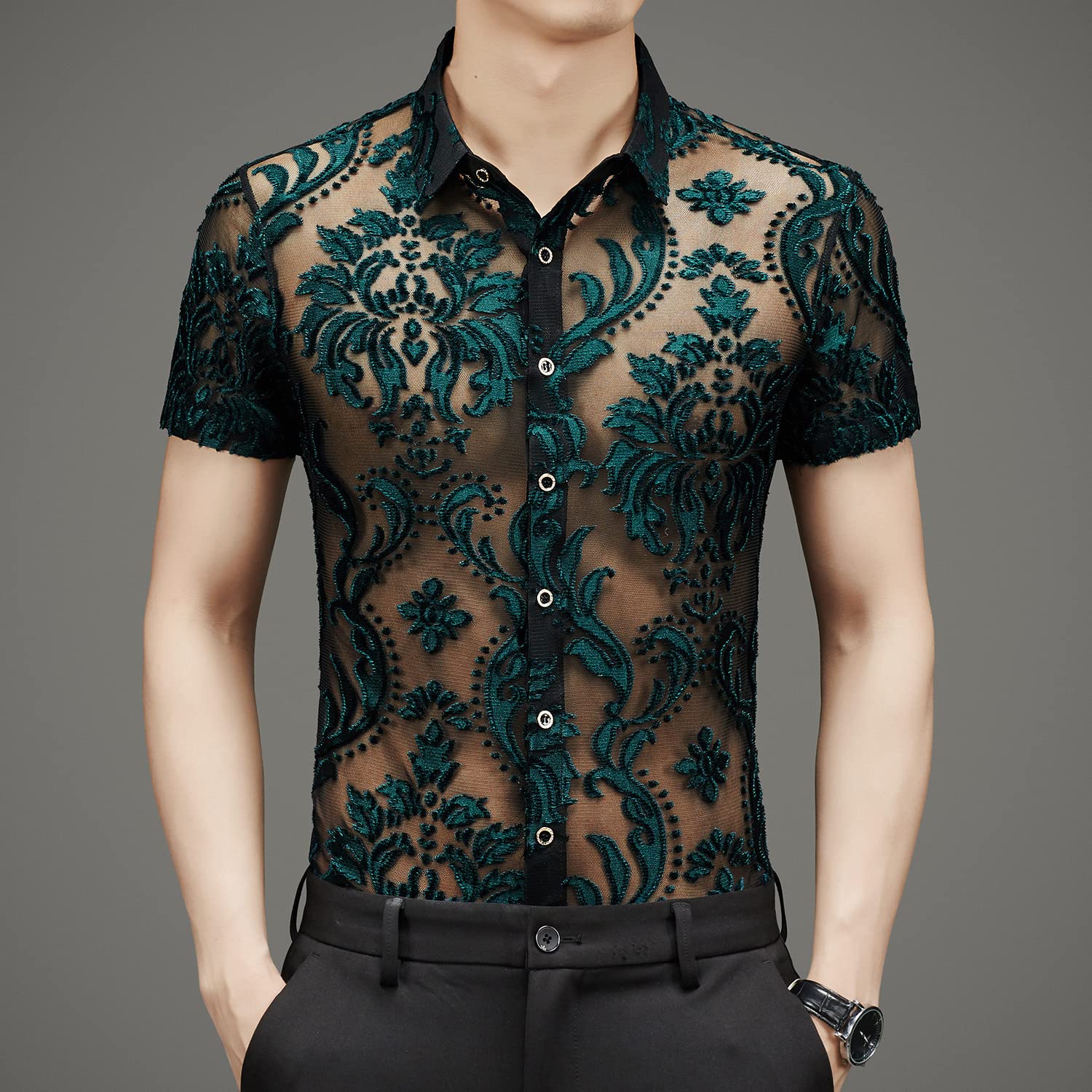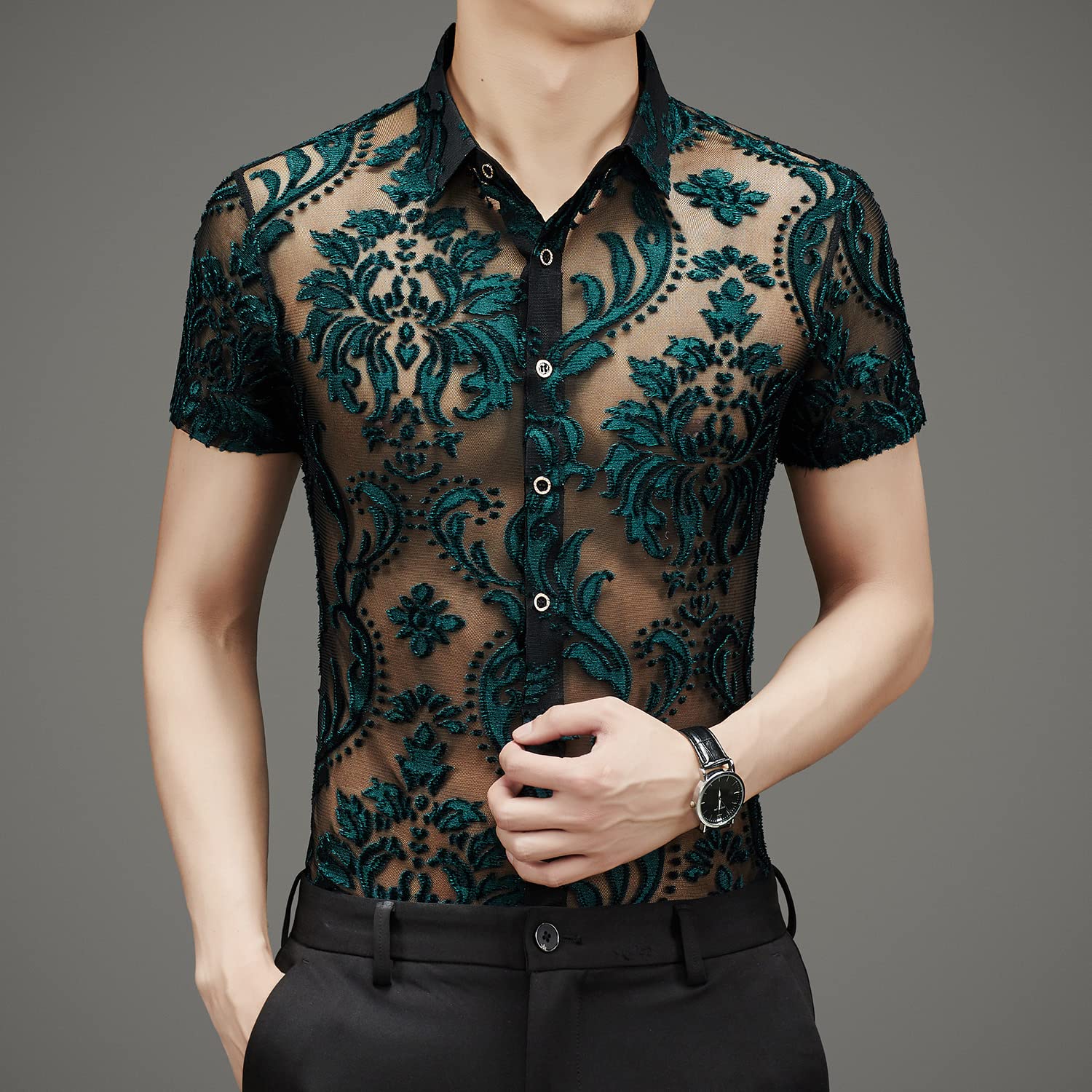 Yonititeee See Through Shirts for Mens Sexy Short Sleeve Flower Fishnet Lace Shirt Green Chest 36 Inches