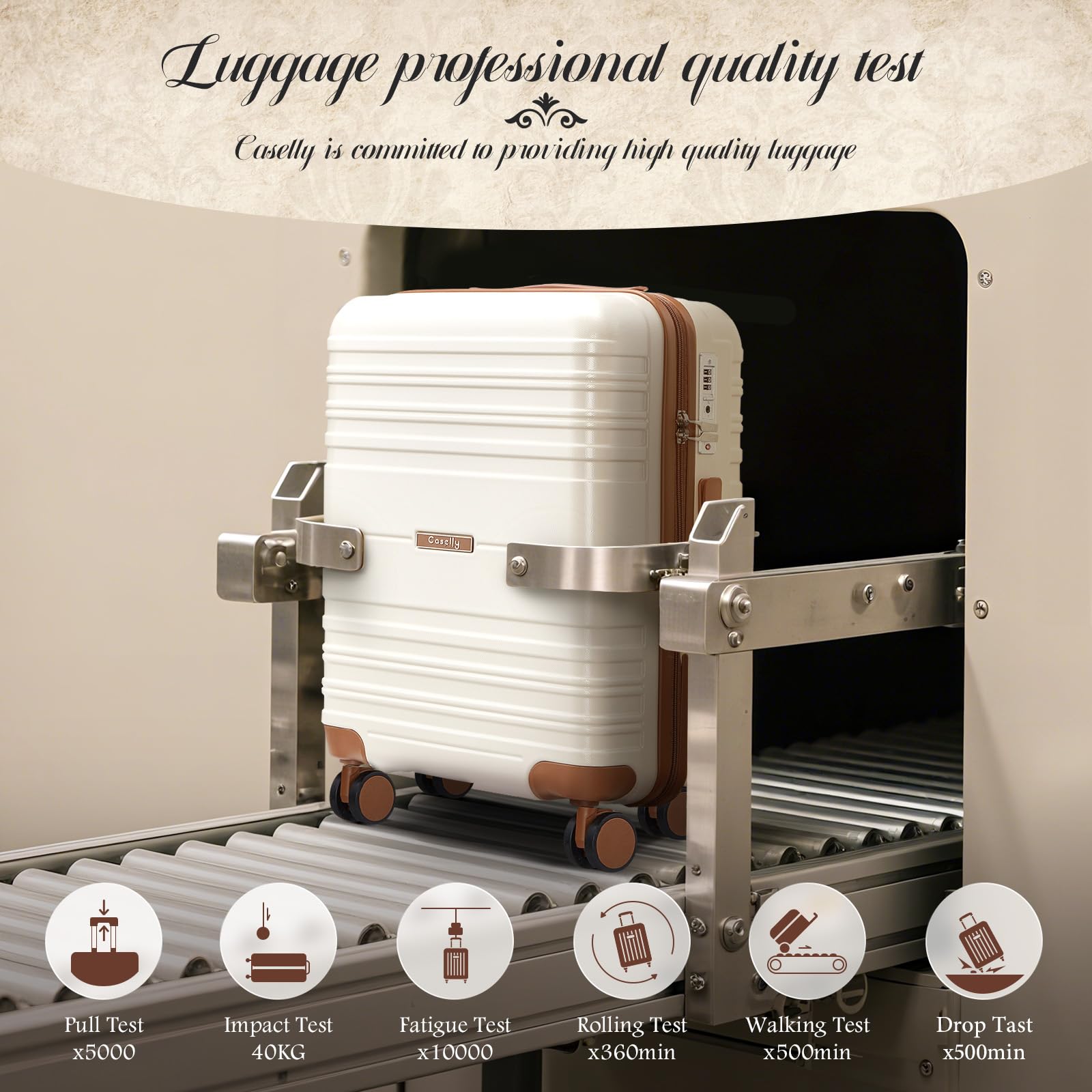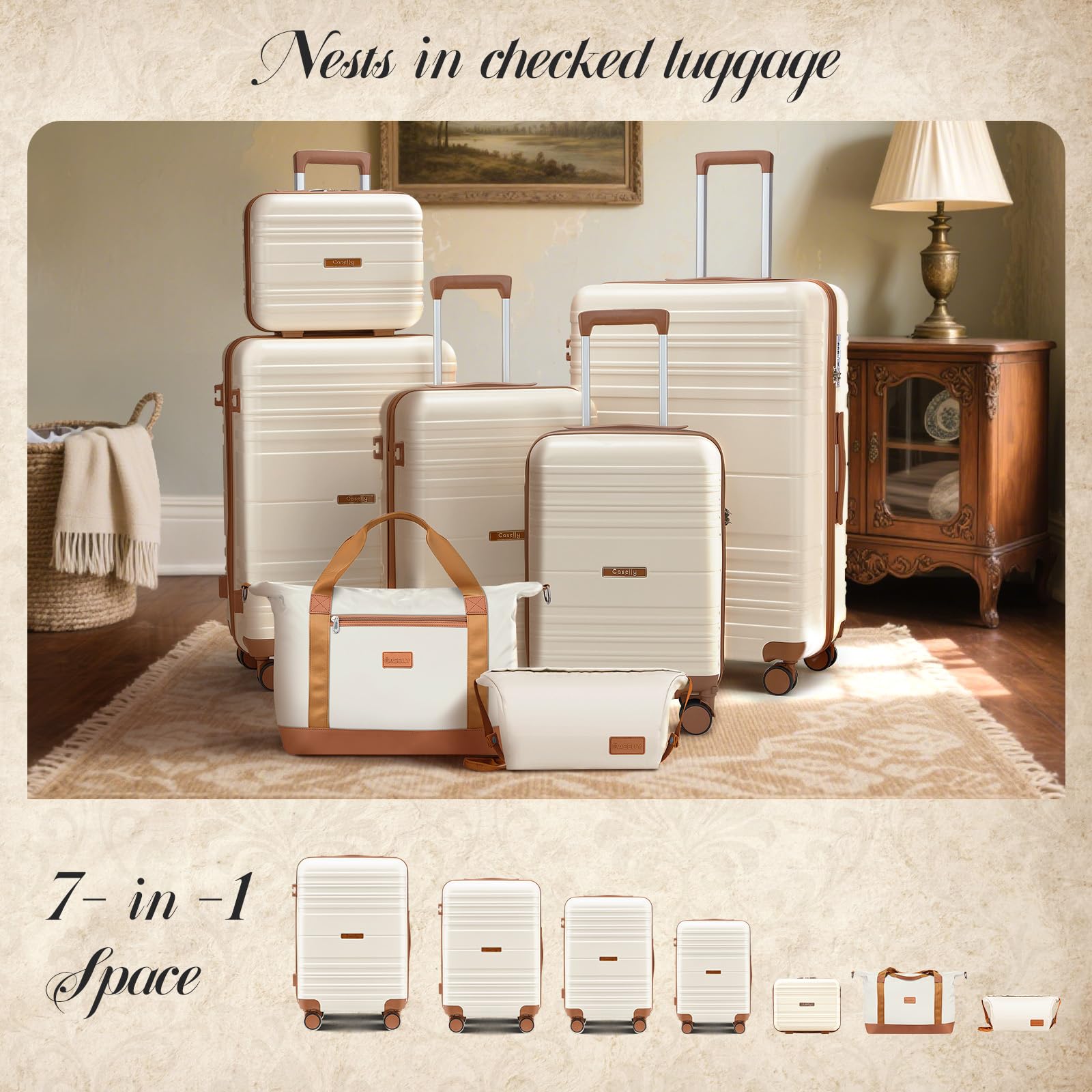 - 【7 Piece Luggage Sets】 The CASELLY 7-piece luggage set includes a 14" cosmetic case, 18" /20" carry-on luggage, 24" medium checked suitcase, 28" large checked suitcase, expandable duffel bag and toiletry bag. All pieces nest together for easy storage, fully equipped for all your travel needs.