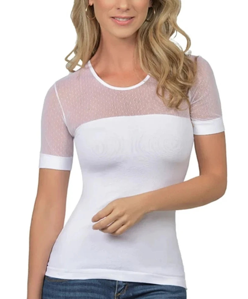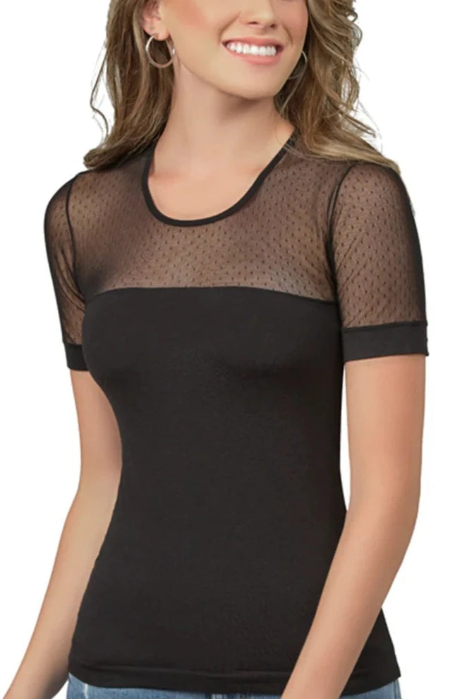 Casual style T-Shirt with a semi-transparent neckline that makes it more youthful and delicate, short sleeves for any type of weather.