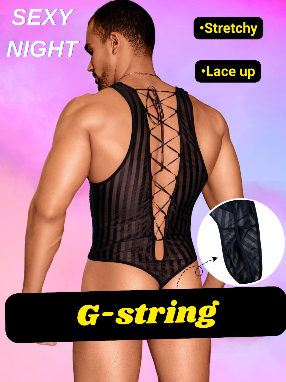 ChiaoLezhee Mesh Bodysuit For Men, Mens Thong Lingerie, Sheer Tank Top Man, Sissy Clothes Singlet Sexy Underwear Fishnet Gay, Black, Large
