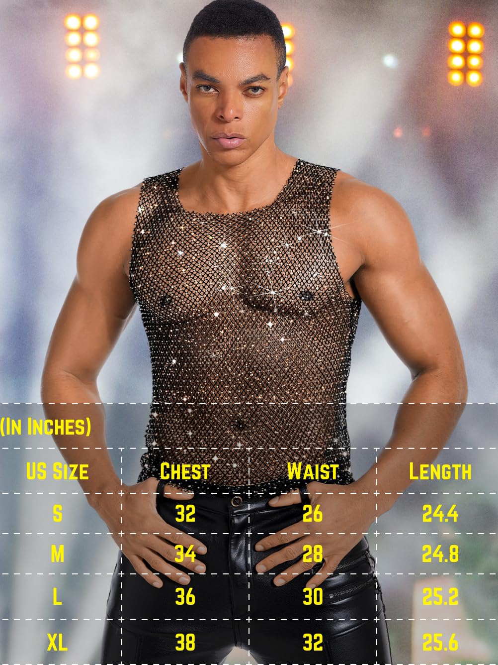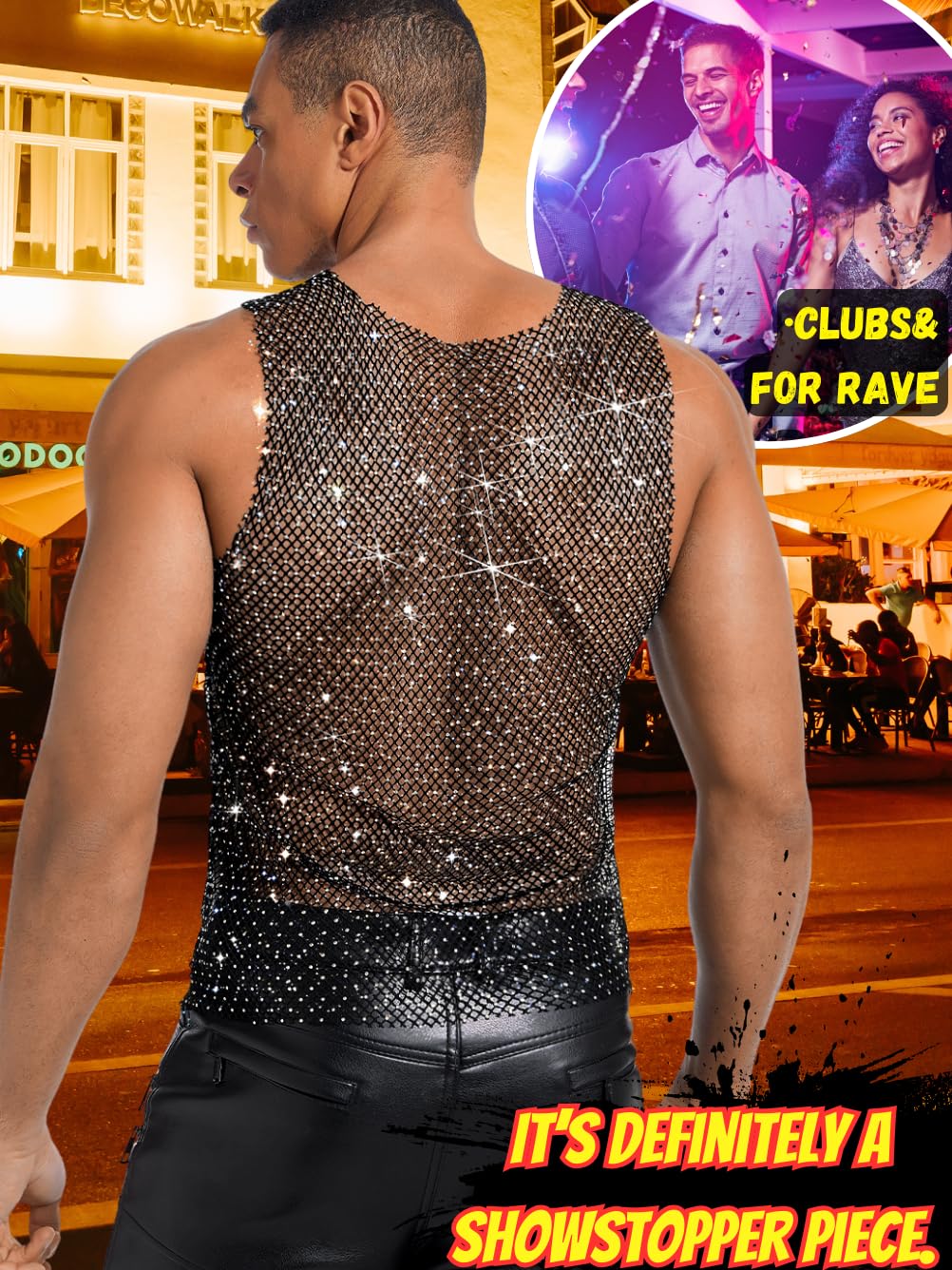 ChiaoLezhee Rhinestones Rave Outfits, Sparkly Mesh Tank Tops, Men's Sexy Sheer Fishnet Shirt for Music Festival, Crewneck Sleeveless Glitter Going Out Vest Crop Clubwear,Black,X-Large