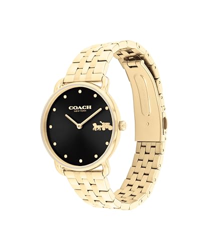 - The Elliot is a modern classic watch for workdays and weekends. It has a gold-tone bracelet and a black dial with dome markers and the iconic Coach Horse and Carriage motif at 3 o'clock.