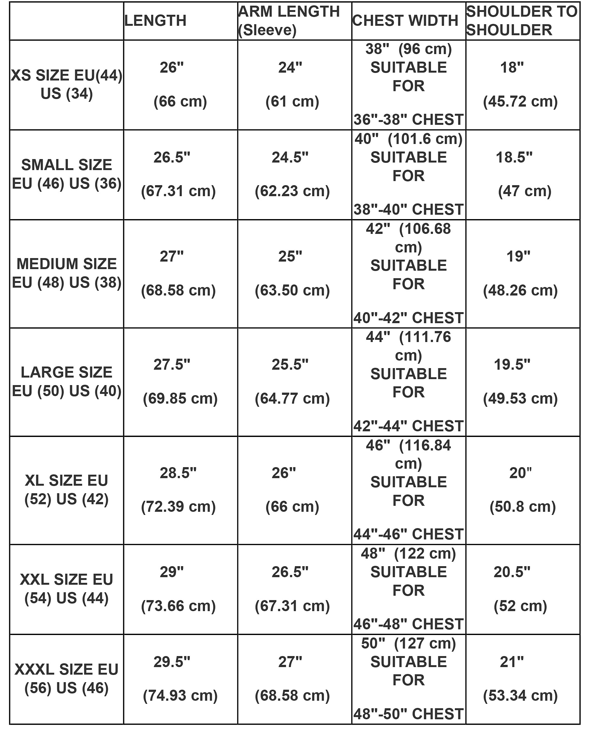 - To ensure it fits properly please refer to our size chart provided in the image gallery. For example, if your chest measurement is 42 to 43 Inches then select size Large.