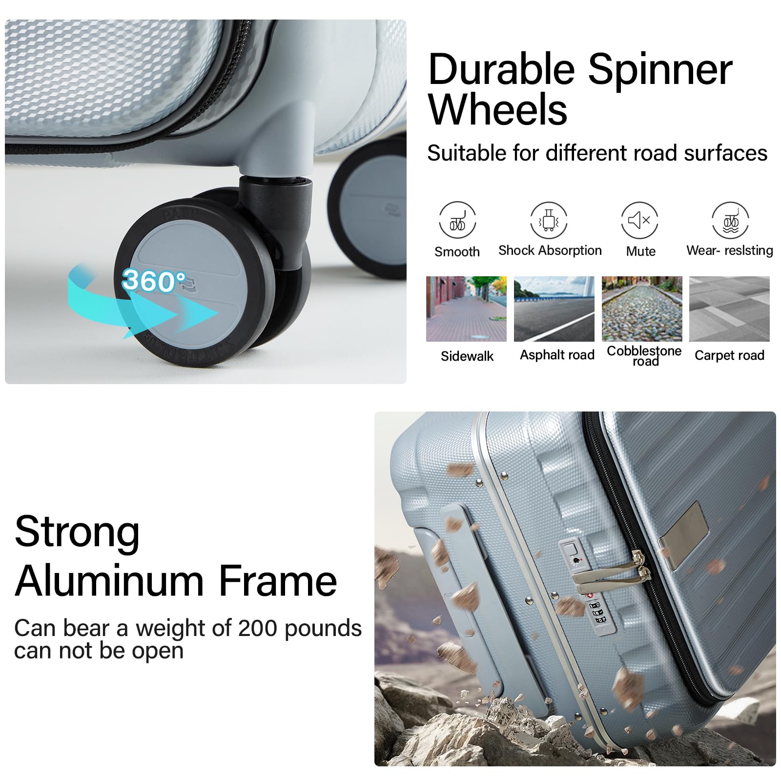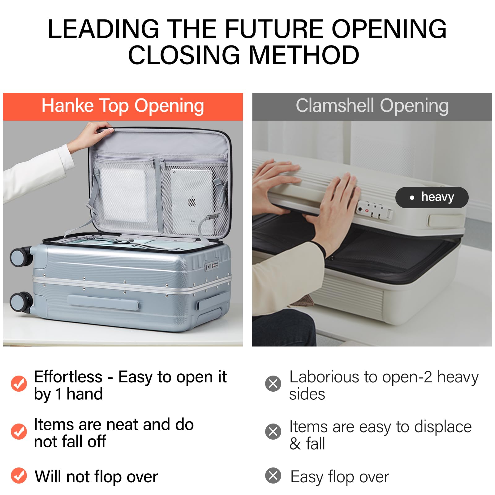 - 【CREATIVE FRONT OPENING】This trunk luggage with spinner wheels Leading the future opening and closing method which is effortless to open or close the suitcase, not only is it easy to load, but it also saves space. This design solves the problem that traditional luggage separated 2 compartments of heavy load then it's difficult to open and close. Importantly, it also avoid the displacement of items.