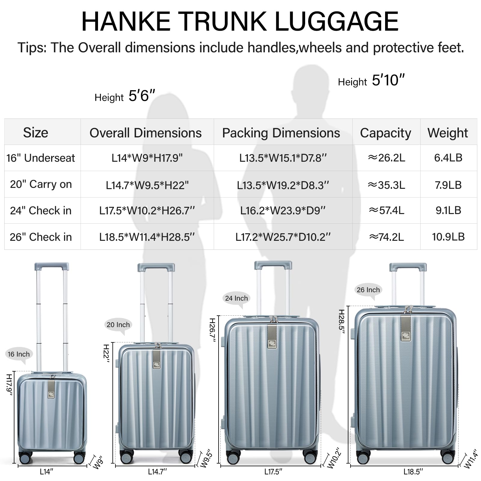 - 【DIMENSION】26 inch luggage overall dimensions is L18.5*W11.4*H28.5"(include handles,wheels and protective feet),packing dimensions is L17.2*W25.7*D10.2",capacity≈74.2L,weight 10.9LB. Checked luggage airline approved.
