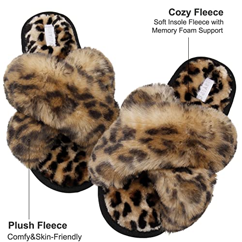 JIASUQI Women's Cross Band Fuzzy House Slippers Soft Plush Furry Faux Fur House Indoor Outdoor Slippers for Women Leopard 8-9