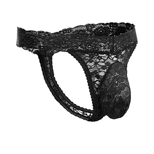 Men's Lace Frilly Sissy Thong Panties Sheer Mesh Bikini Briefs T-back G-string Underwear Black X-Large
