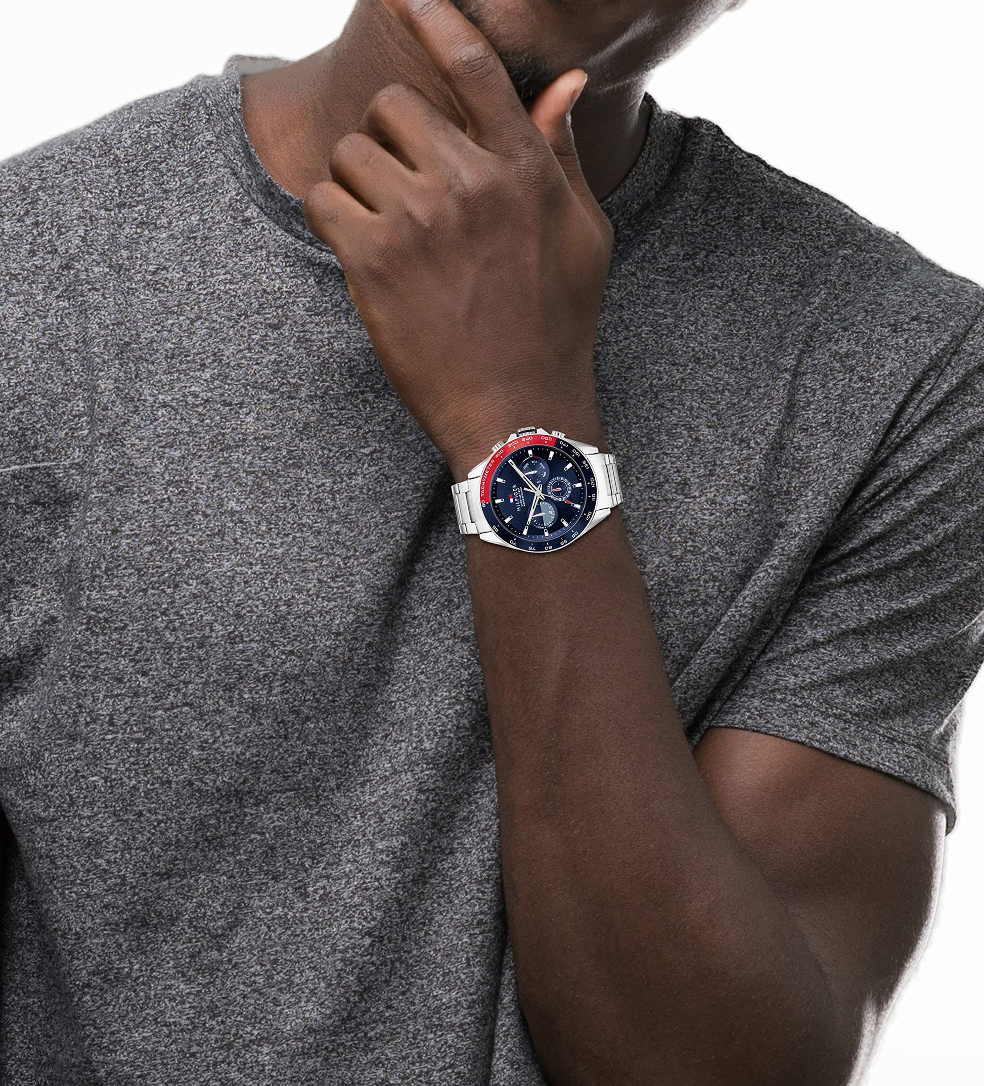 - Quality Materials: Tommy Hilfiger Men's, 46 mm stainless steel case and bracelet, red/blue bezel with blue dial.