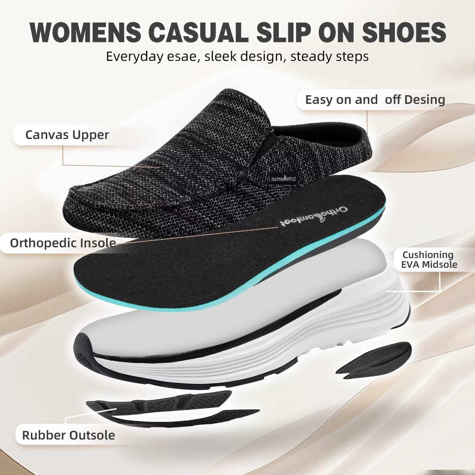 Women's Orthopedic Slip On Slippers Shoes: Comfortable Womens Slip-On for Flat Feet, Light-Weight Slippers for Plantar Fasciitis Relief, Cushioned Rubber Sole Loafers for Comfy Working Black Size 9